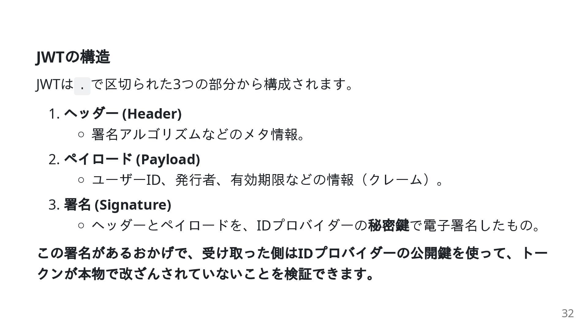 ペイロード (Payload) ユーザーID、発行者、有効期限などの情報(クレーム)。 3. 署名 (Signature) ヘッダーとペイロードを、IDプロバイダーの 秘密鍵で電子署名したもの。 この署名があるおかげで、受け取った側はID プロバイダーの公開鍵を使って、トー クンが本物で改ざんされていないことを検証できます。 32