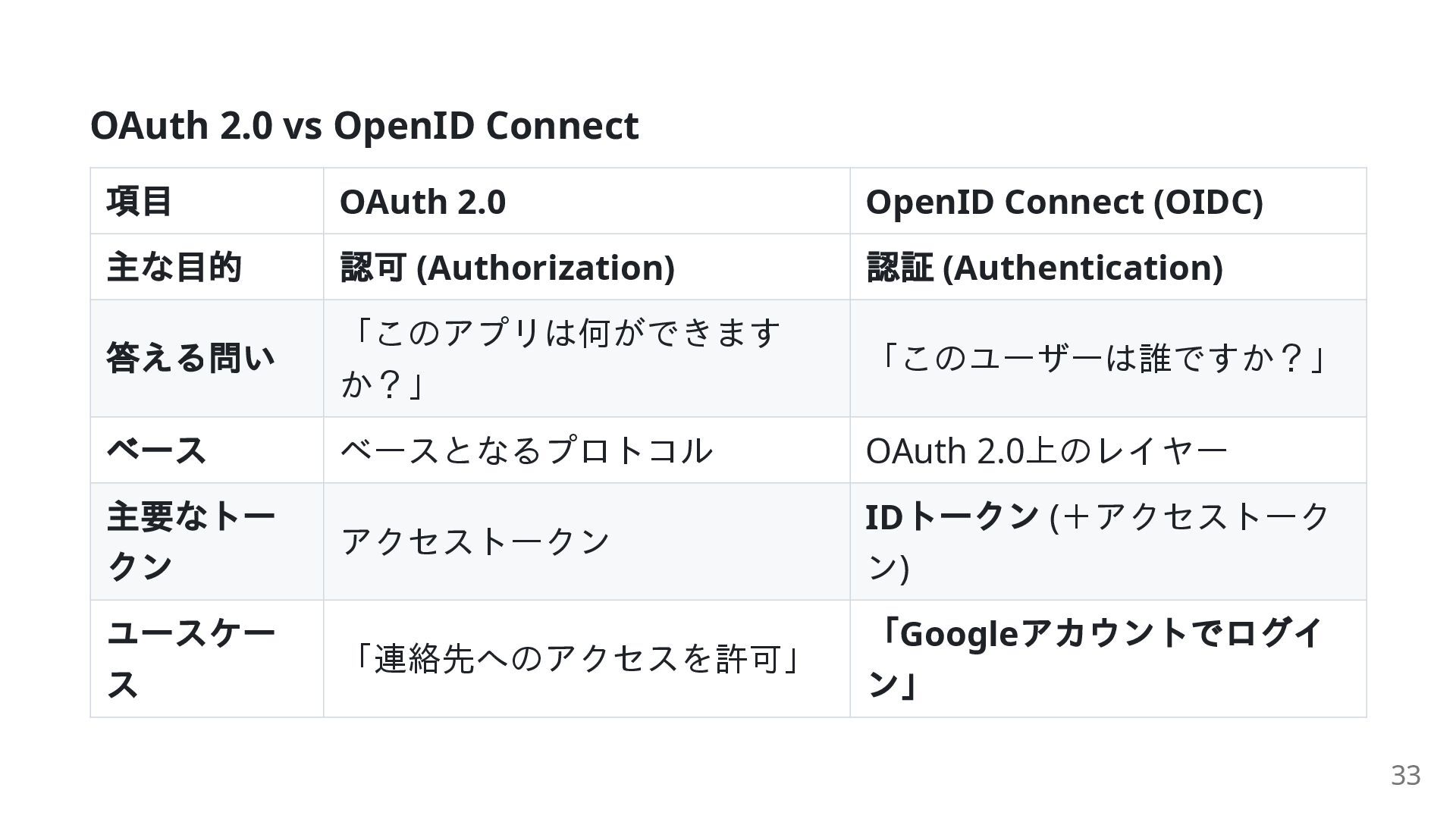 (OIDC) 主な目的 認可 (Authorization) 認証 (Authentication) 答える問い 「このアプリは何ができます か?」 「このユーザーは誰ですか?」 ベース ベースとなるプロトコル OAuth 2.0上のレイヤー 主要なトー クン アクセストークン ID トークン (+アクセストーク ン) ユースケー ス 「連絡先へのアクセスを許可」 「Google アカウントでログイ ン」 33