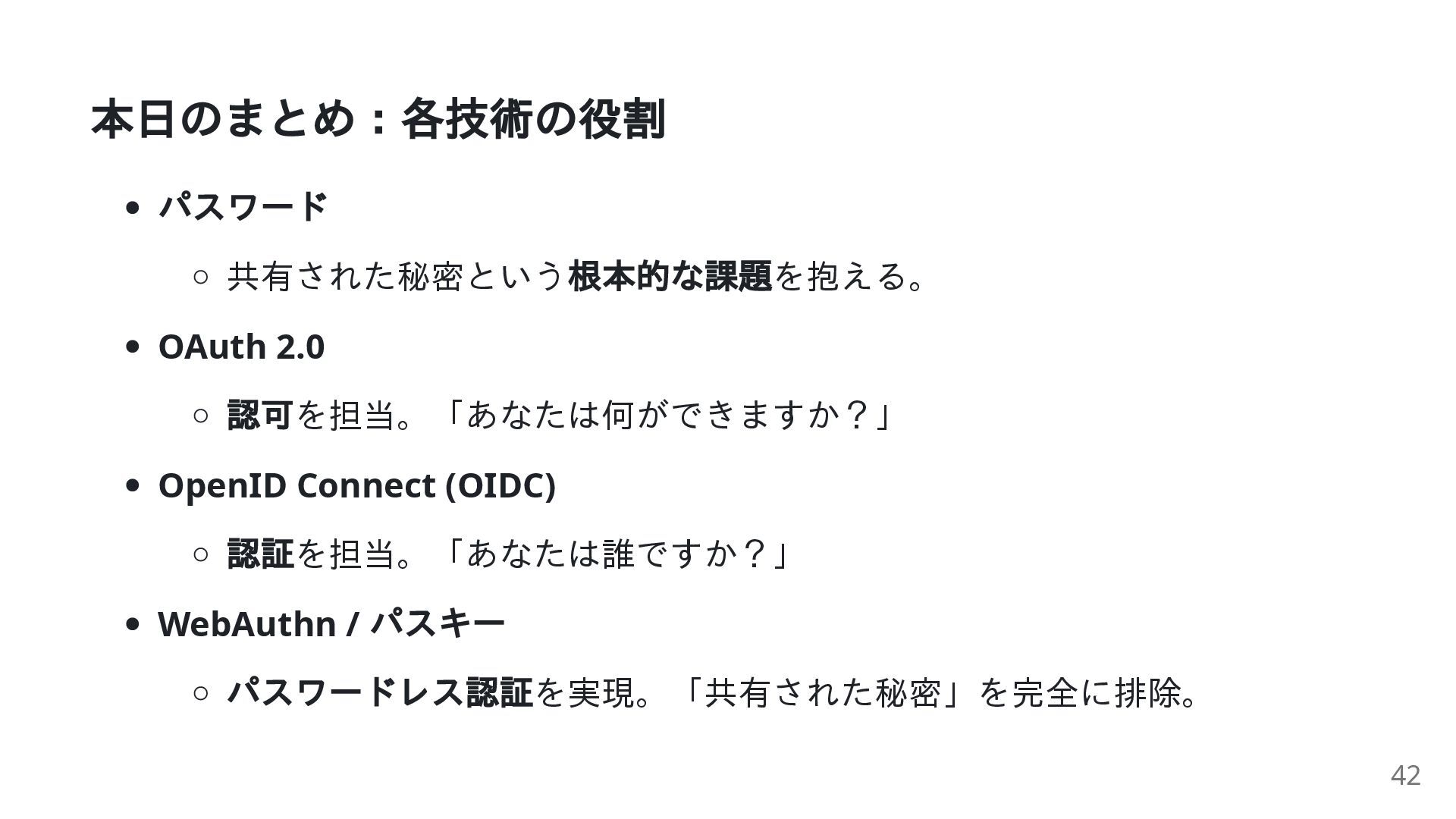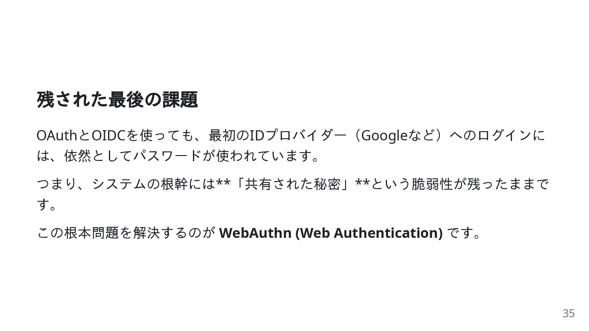 残された最後の課題 OAuthとOIDCを使っても、最初のIDプロバイダー(Googleなど)へのログインに は、依然としてパスワードが使われています。 つまり、システムの根幹には**「共有された秘密」**という脆弱性が残ったままで す。 この根本問題を解決するのが WebAuthn (Web Authentication) です。