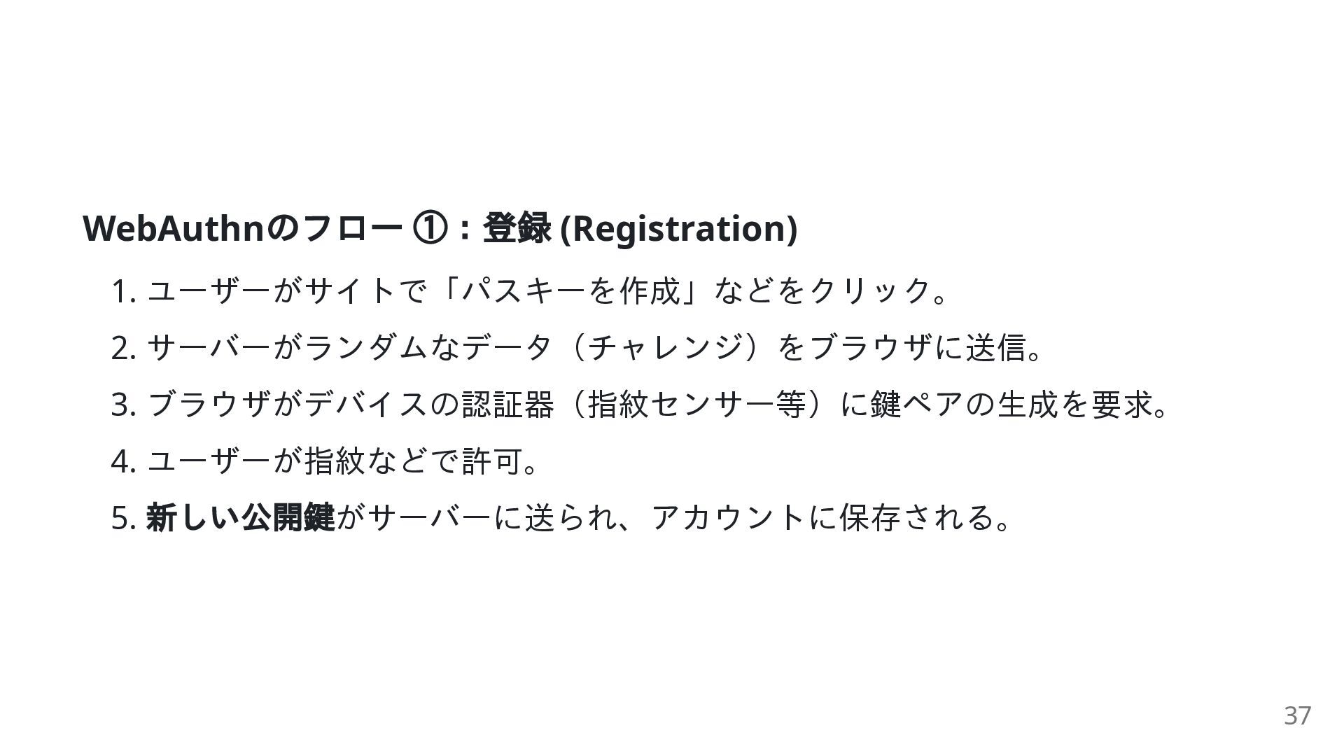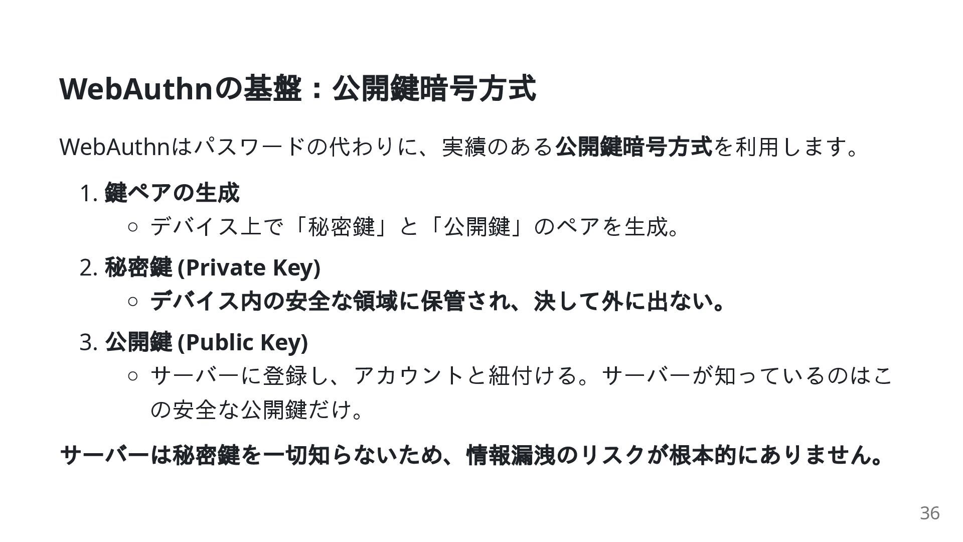 Key) デバイス内の安全な領域に保管され、決して外に出ない。 3. 公開鍵 (Public Key) サーバーに登録し、アカウントと紐付ける。サーバーが知っているのはこ の安全な公開鍵だけ。 サーバーは秘密鍵を一切知らないため、情報漏洩のリスクが根本的にありません。 36