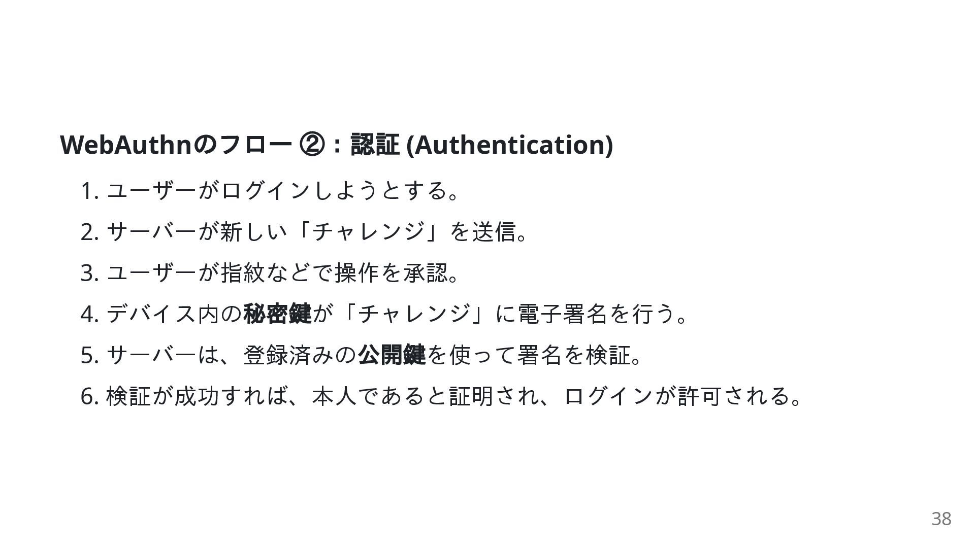 4. デバイス内の 秘密鍵が「チャレンジ」に電子署名を行う。 5. サーバーは、登録済みの 公開鍵を使って署名を検証。 6. 検証が成功すれば、本人であると証明され、ログインが許可される。 38