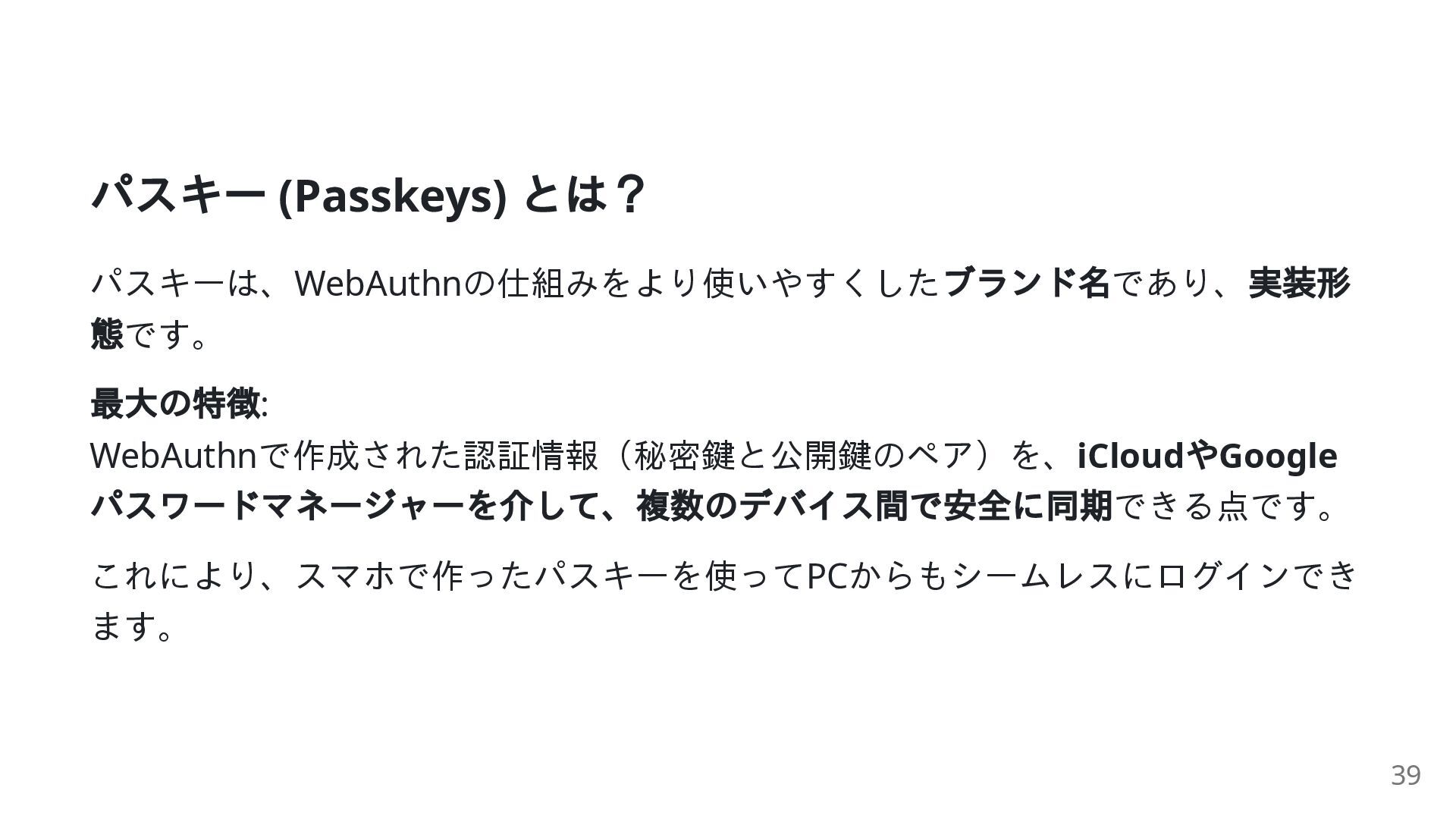 パスワードマネージャーを介して、複数のデバイス間で安全に同期できる点です。 これにより、スマホで作ったパスキーを使ってPCからもシームレスにログインでき ます。 39