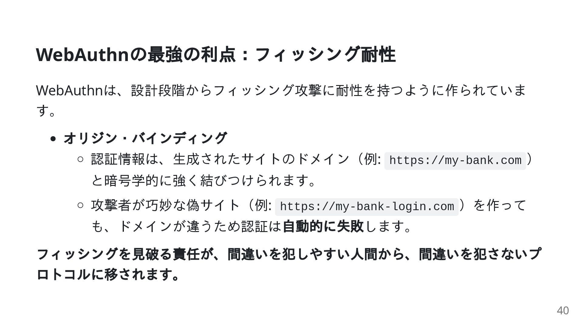 WebAuthn の最強の利点:フィッシング耐性 WebAuthnは、設計段階からフィッシング攻撃に耐性を持つように作られていま す。 オリジン・バインディング 認証情報は、生成されたサイトのドメイン(例: https://my-bank.com ) と暗号学的に強く結びつけられます。 攻撃者が巧妙な偽サイト(例: