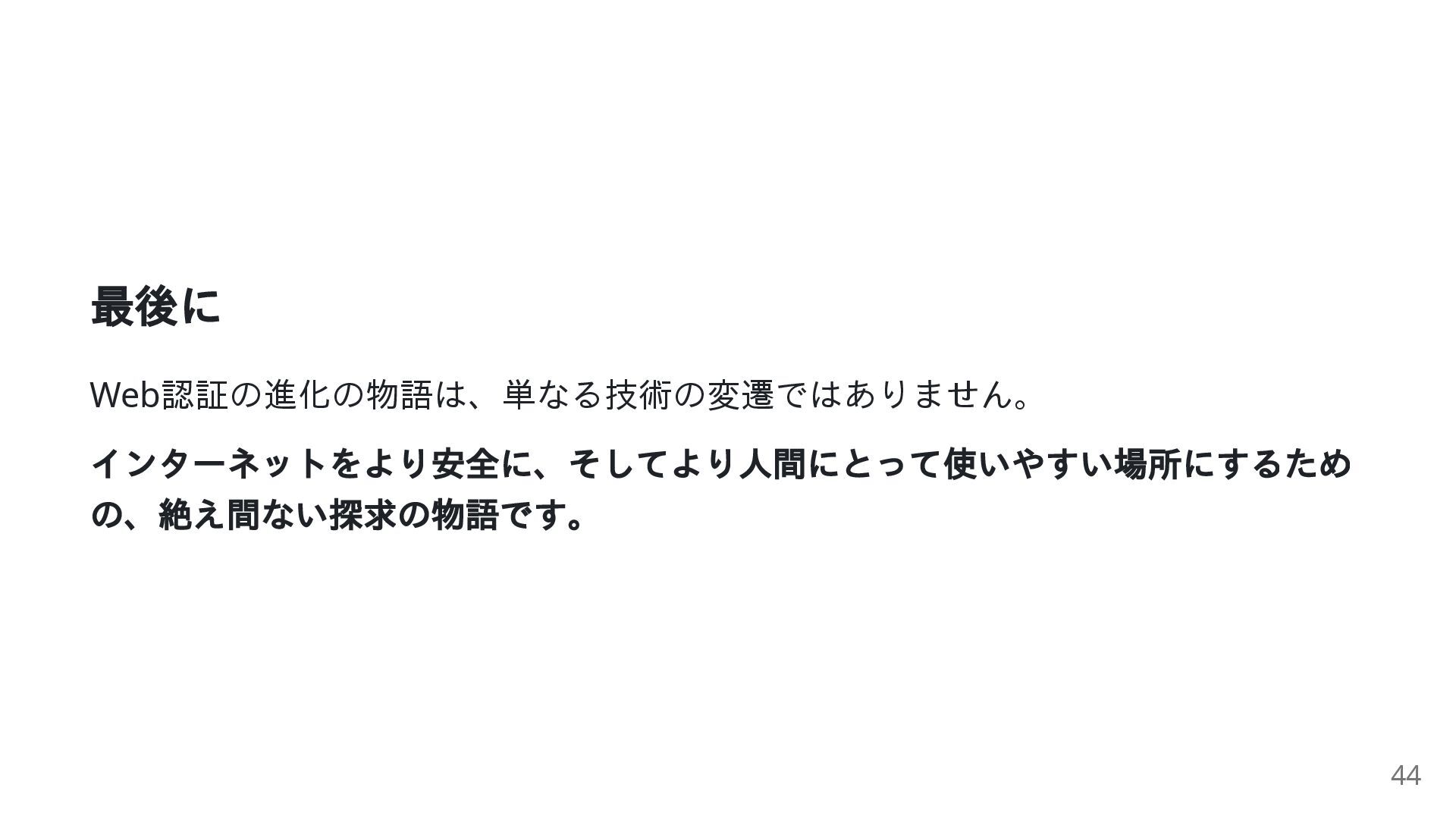 最後に Web認証の進化の物語は、単なる技術の変遷ではありません。 インターネットをより安全に、そしてより人間にとって使いやすい場所にするため の、絶え間ない探求の物語です。 44