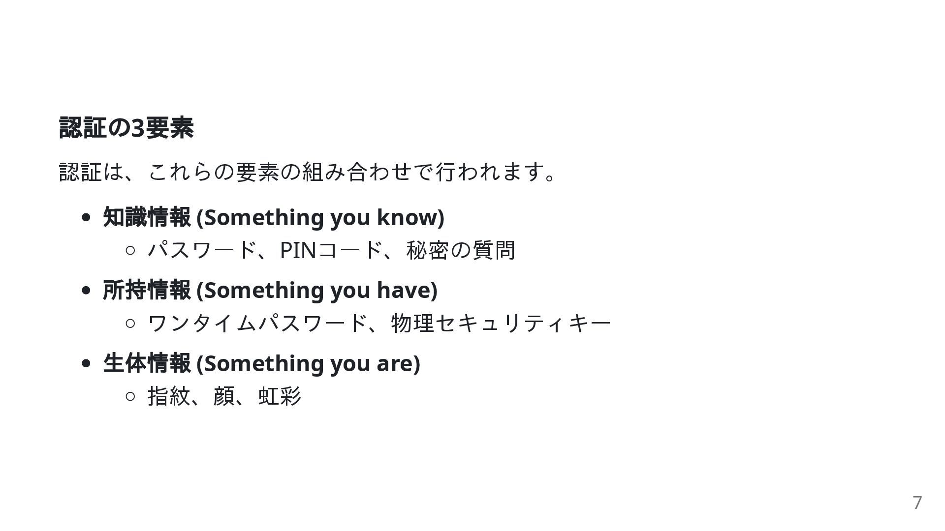 認証の3 要素 認証は、これらの要素の組み合わせで行われます。 知識情報 (Something you know) パスワード、PINコード、秘密の質問 所持情報 (Something