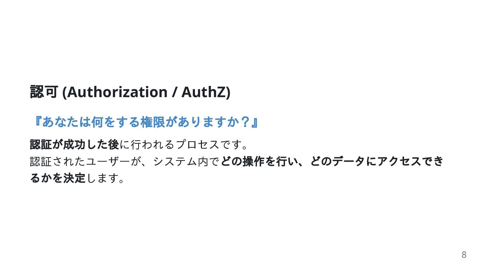 認可 (Authorization / AuthZ) 『あなたは何をする権限がありますか?』 認証が成功した後に行われるプロセスです。 認証されたユーザーが、システム内で どの操作を行い、どのデータにアクセスでき るかを決定します。 8