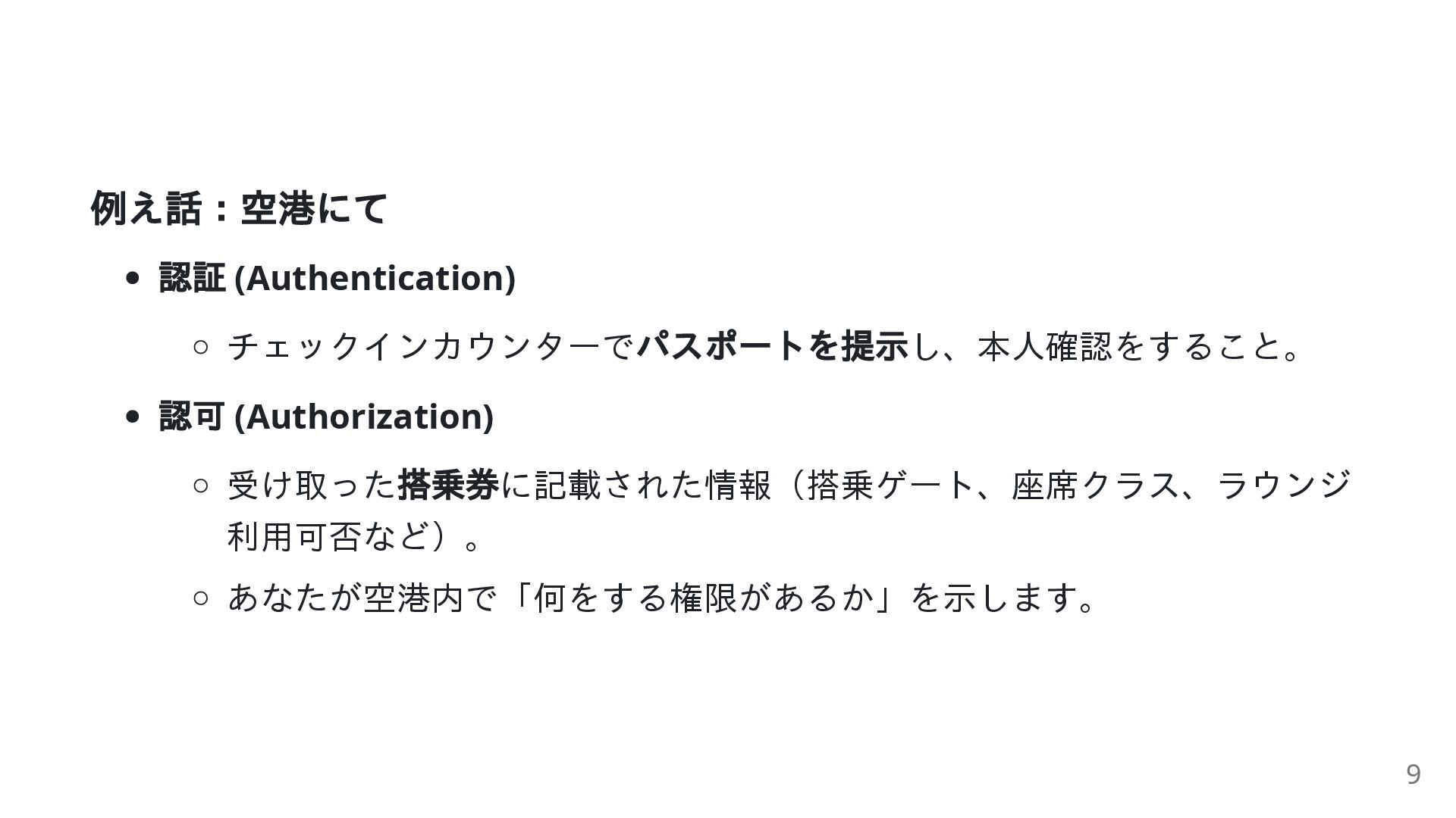 例え話:空港にて 認証 (Authentication) チェックインカウンターで パスポートを提示し、本人確認をすること。 認可 (Authorization) 受け取った 搭乗券に記載された情報(搭乗ゲート、座席クラス、ラウンジ 利用可否など)。
