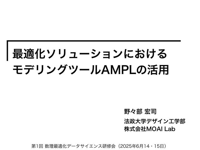 for Mathematical Programming, by R. Fourer, D.M.Gay and B.W. Kernighan AMPLのバイブル.詳細な解説と多数の例題 AMPL公式サイトからダウンロード可能 AMPL Discourse(https://discuss.ampl.com/) 質問したり,他のユーザーと議論したりする場 学習リソース