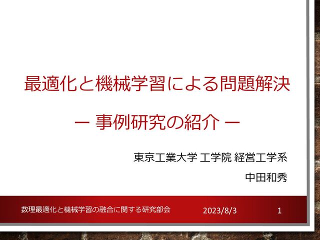 K. Mizutani, M. Azami, K. Ishizuka, and K. Nakata. “Predic=ng response probability by embedding ques=ons in online ques=on recommenda=on”. Proceedings of Web Intelligence and Intelligence Agent Technology(WI-IAT 2022), 21, 2022. • 業種横断的なアンケートデータ︓ 階層ベイズを⽤いた満⾜度の推定 + 相関を考慮した企業間コラボレーションの最適化 Y. Hoshino, R. Matsui, K. Ishizuka, K. Ishikawa, T. Umetsu, and K. Nakata. “Hierarchical Bayesian recommenda=on model for inter-company collabora=on using cross-industry ques=onnaire”. Proceedings of 2022 IEEE 9th Interna=onal Conference on Industrial Engineering and Applica=ons (ICIEA 2022), 9, 2022. • ファッションECサイト︓ 転移学習を⽤いた購買予測 + 全体最適化による推薦が偏らないようなブランド推薦 ⽥村悠, 吉住宗朔, 福永峻, 三宅聡⼀郎, ⽚⼭翔太, 中⽥和秀.「ファッションECサイトにおけるアン ケートを⽤いたブランド推薦システム」. オペレーションズ・リサーチ, 63, pp. 91-98, 2018. 2023/8/3 MOAI FORUM 2