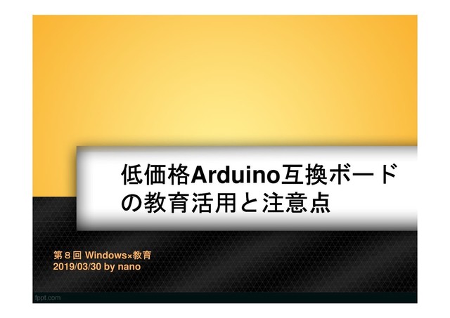 ロボット教育に活用されている Arduino はハードとソフトの設計が公開されているため互換ボードが低価格で購入できます。現在購入できる互換ボードを調査して,お薦めの互換ボードを選定し,お薦めポイントと注意点を資料にまとめました。合わせて最新の高機能な互換ボードも紹介します。本資料は大阪教育大学で開催された 「第8回 Windows×教育」(2019/3/30)で LT 発表したものです。