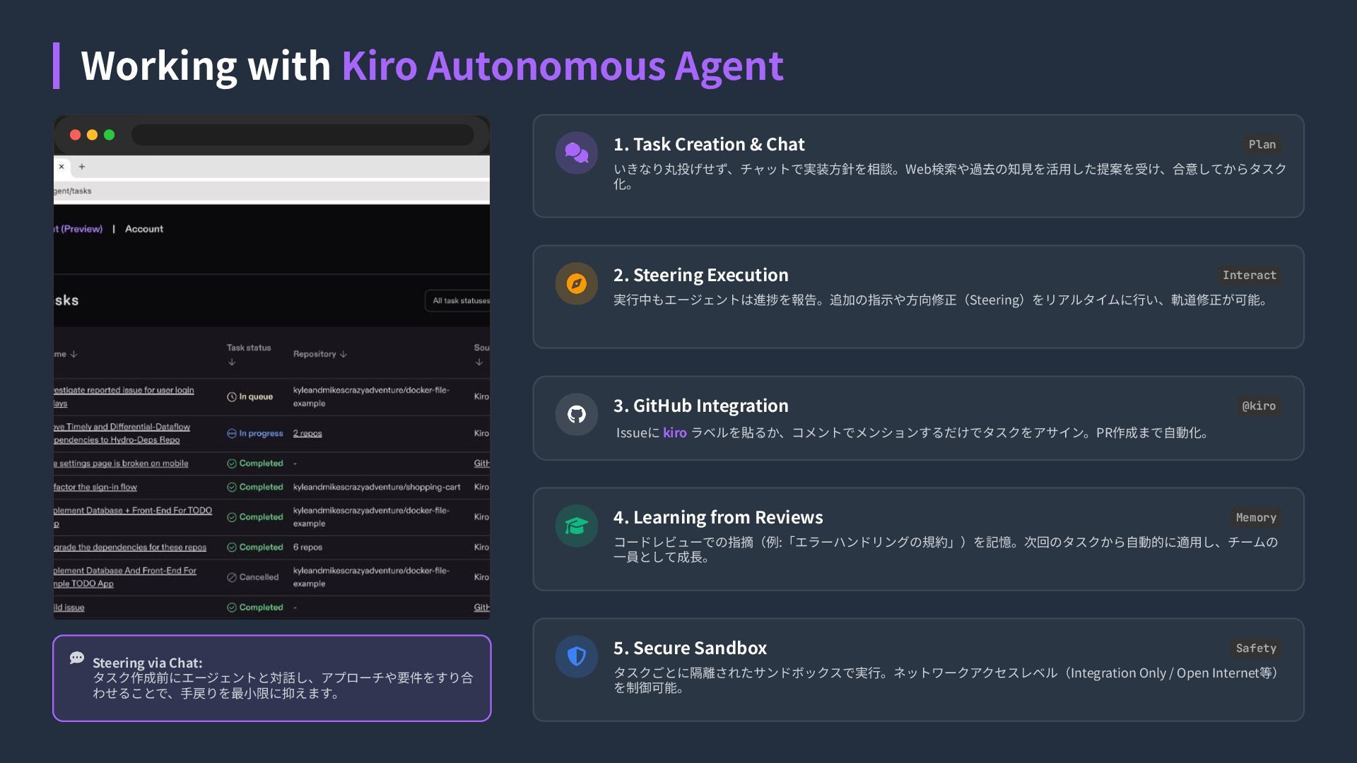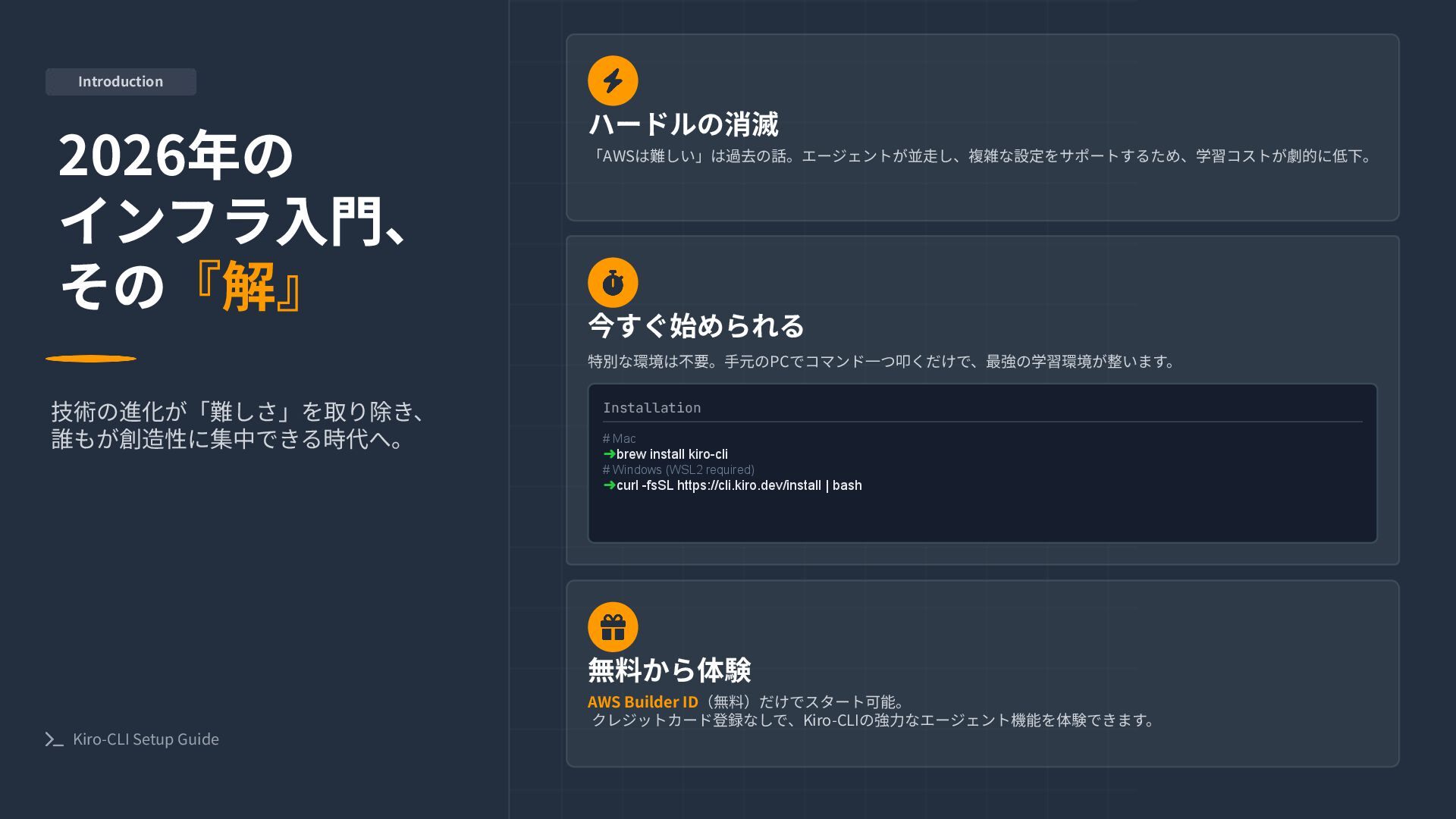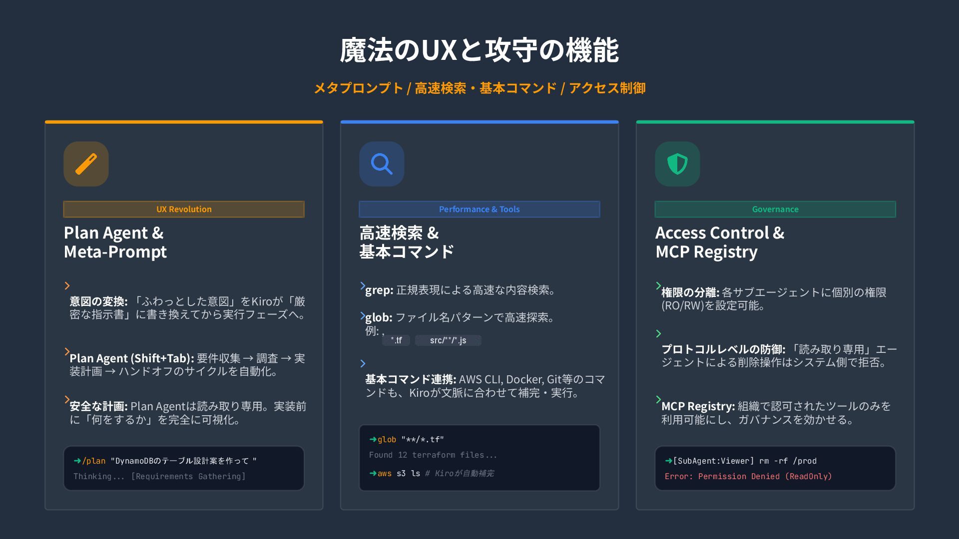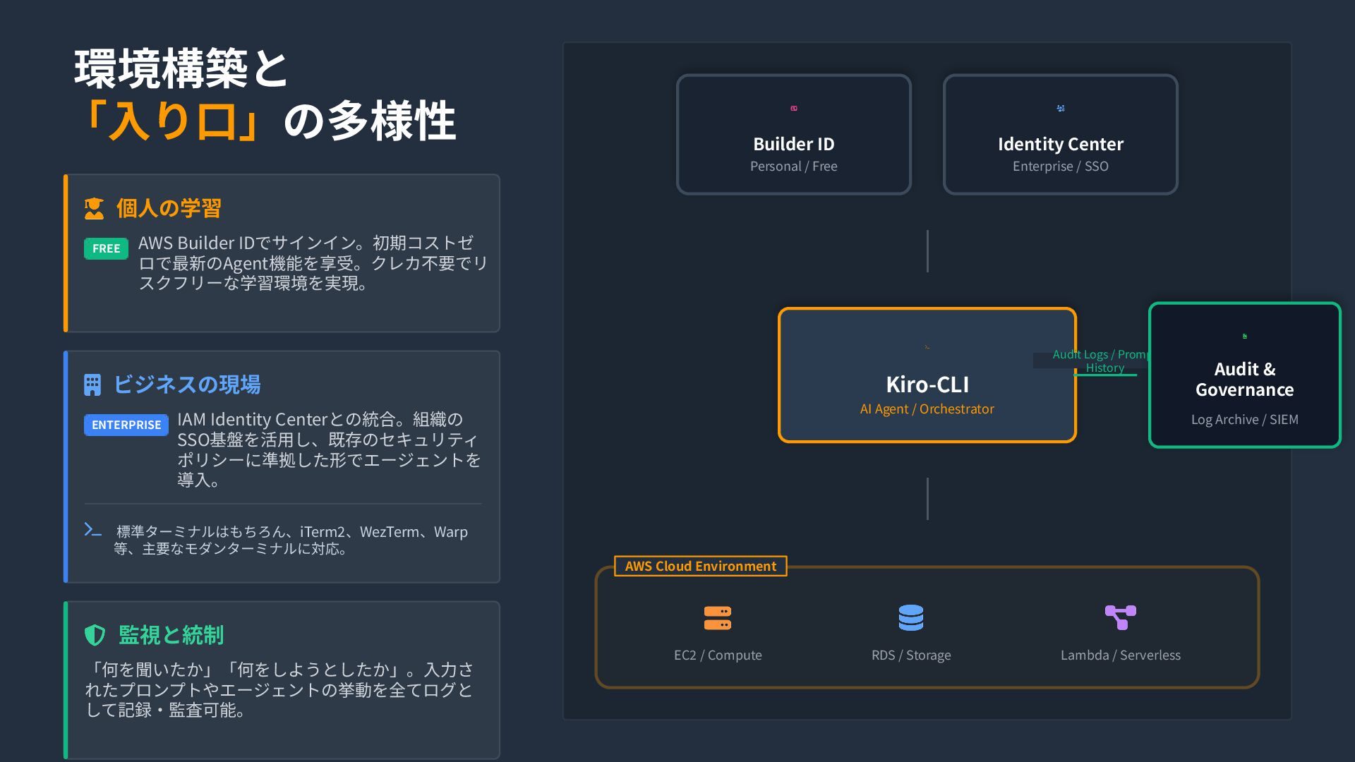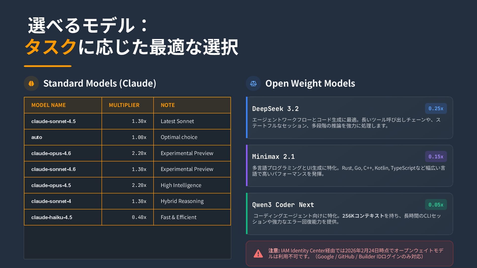 1.30x Latest Sonnet auto 1.00x Optimal choice claude-opus-4.6 2.20x Experimental Preview claude-sonnet-4.6 1.30x Experimental Preview claude-opus-4.5 2.20x High Intelligence claude-sonnet-4 1.30x Hybrid Reasoning claude-haiku-4.5 0.40x Fast & Efficient Open Weight Models 注意: IAM Identity Center経由では2026年2⽉24⽇時点でオープンウェイトモデ ルは利⽤不可です。(Google / GitHub / Builder IDログインのみ対応) DeepSeek 3.2 0.25x エージェントワークフローとコード⽣成に最適。⻑いツール呼び出しチェーンや、ス テートフルなセッション、多段階の推論を強⼒に処理します。 Minimax 2.1 0.15x 多⾔語プログラミングとUI⽣成に特化。Rust, Go, C++, Kotlin, TypeScriptなど幅広い⾔ 語で⾼いパフォーマンスを発揮。 Qwen3 Coder Next 0.05x コーディングエージェント向けに特化。256Kコンテキストを持ち、⻑時間のCLIセッ ションや強⼒なエラー回復能⼒を提供。