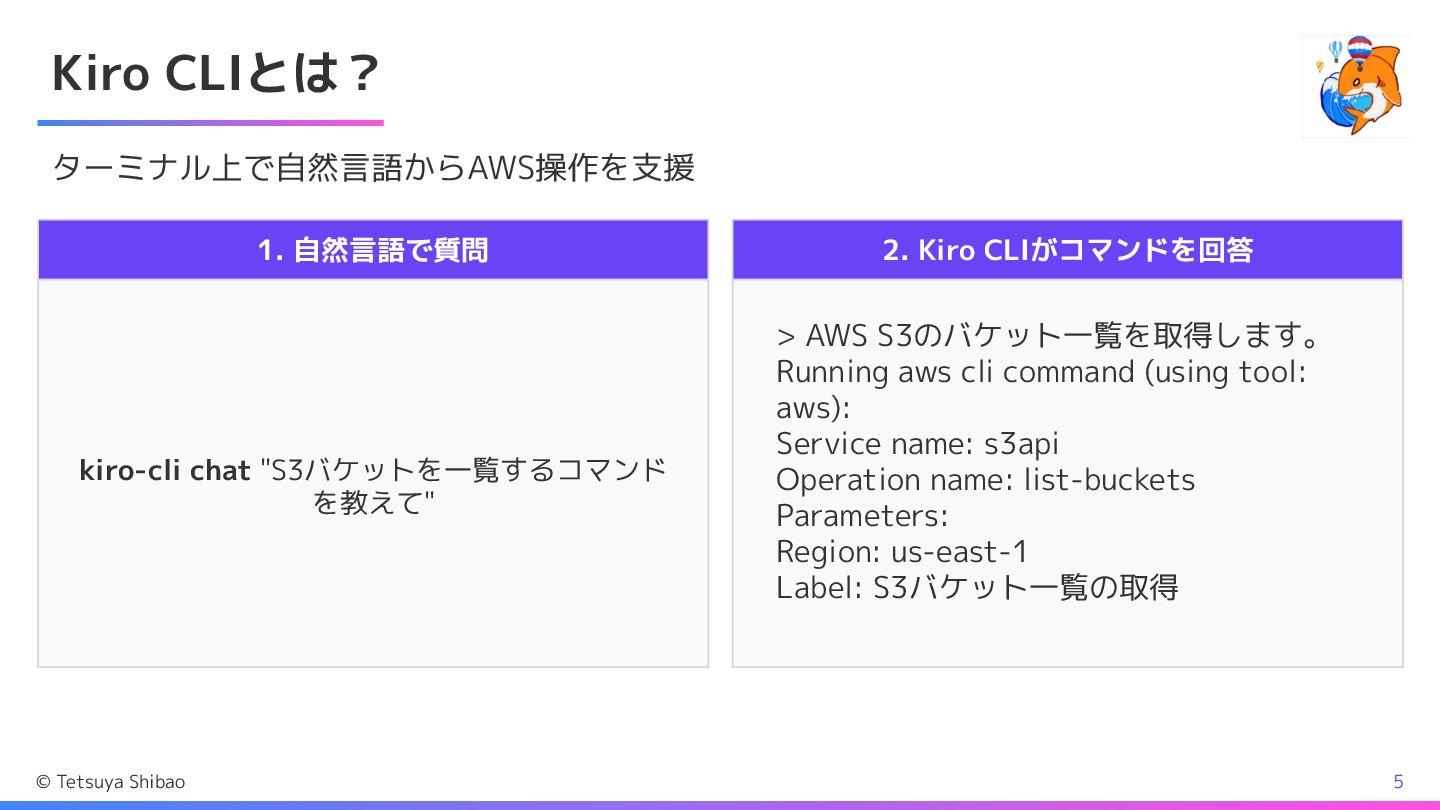 Kiro CLIとは? ターミナル上で自然言語からAWS操作を支援 1. 自然言語で質問 kiro-cli chat "S3バケットを一覧するコマンド を教えて" 2.