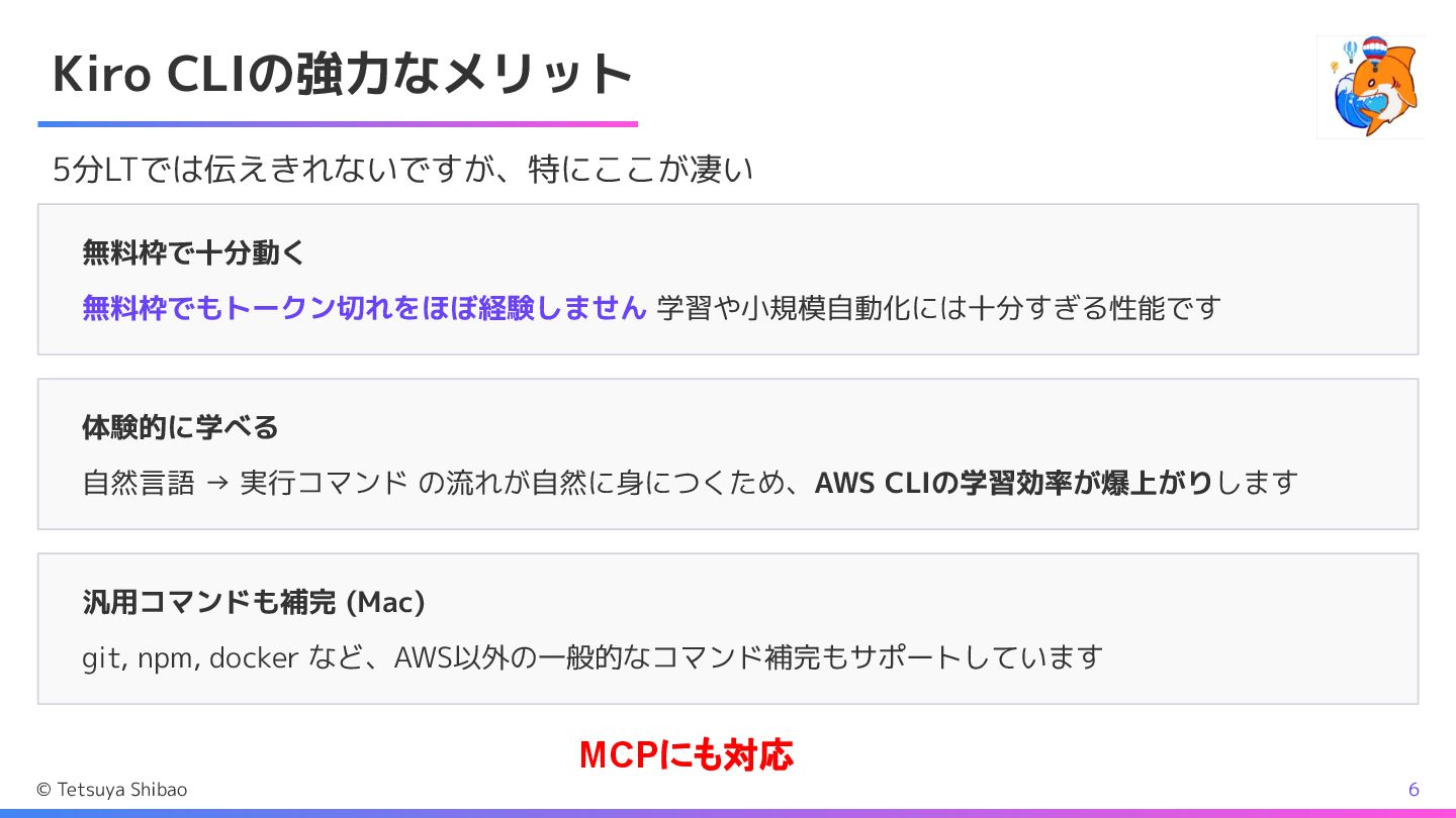 の流れが自然に身につくため、AWS CLIの学習効率が爆上がりします 汎用コマンドも補完 (Mac) git, npm, docker など、AWS以外の一般的なコマンド補完もサポートしています © Tetsuya Shibao 6 MCPにも対応