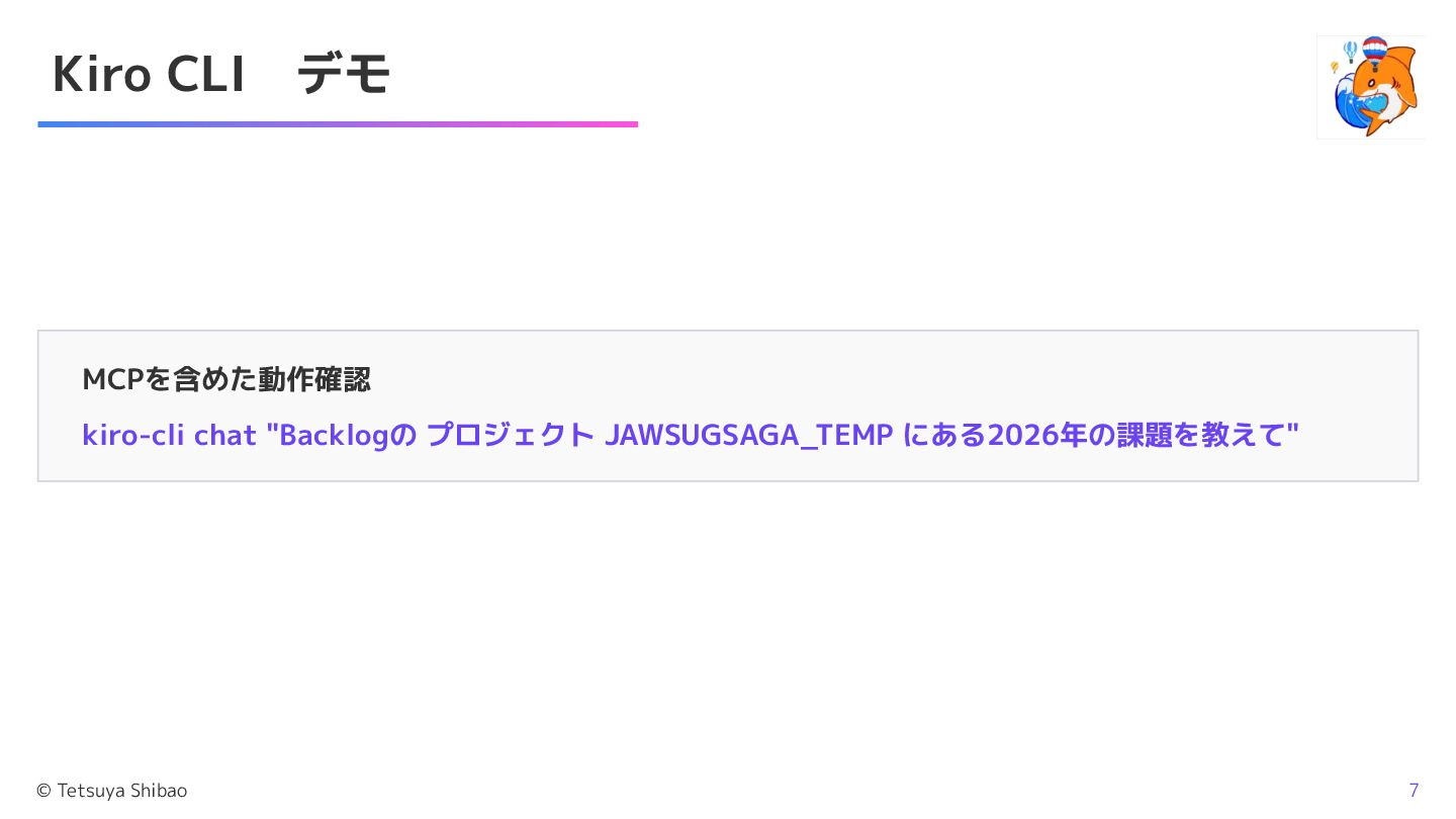 Kiro CLI デモ MCPを含めた動作確認 kiro-cli chat "Backlogの プロジェクト JAWSUGSAGA_TEMP にある2026年の課題を教えて" ©
