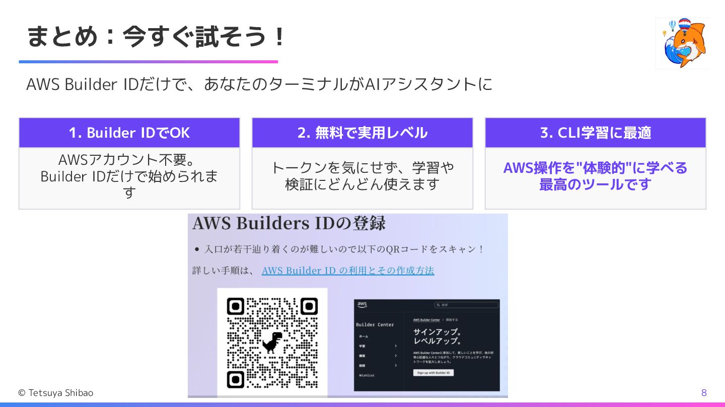 まとめ:今すぐ試そう! AWS Builder IDだけで、あなたのターミナルがAIアシスタントに 1. Builder IDでOK AWSアカウント不要。 Builder IDだけで始められま
