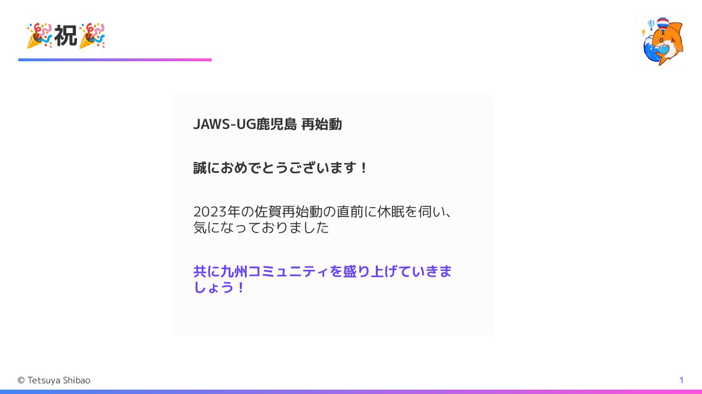 🎉祝🎉 JAWS-UG鹿児島 再始動 誠におめでとうございます! 2023年の佐賀再始動の直前に休眠を伺い、 気になっておりました 共に九州コミュニティを盛り上げていきま しょう! © Tetsuya