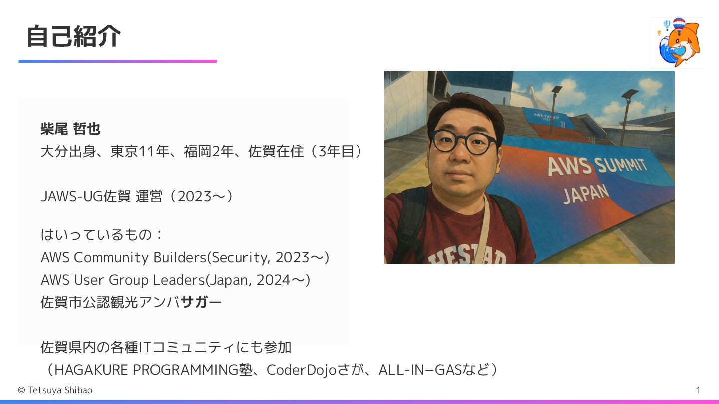 自己紹介 柴尾 哲也 大分出身、東京11年、福岡2年、佐賀在住(3年目) JAWS-UG佐賀 運営(2023〜) はいっているもの: AWS Community Builders(Security,