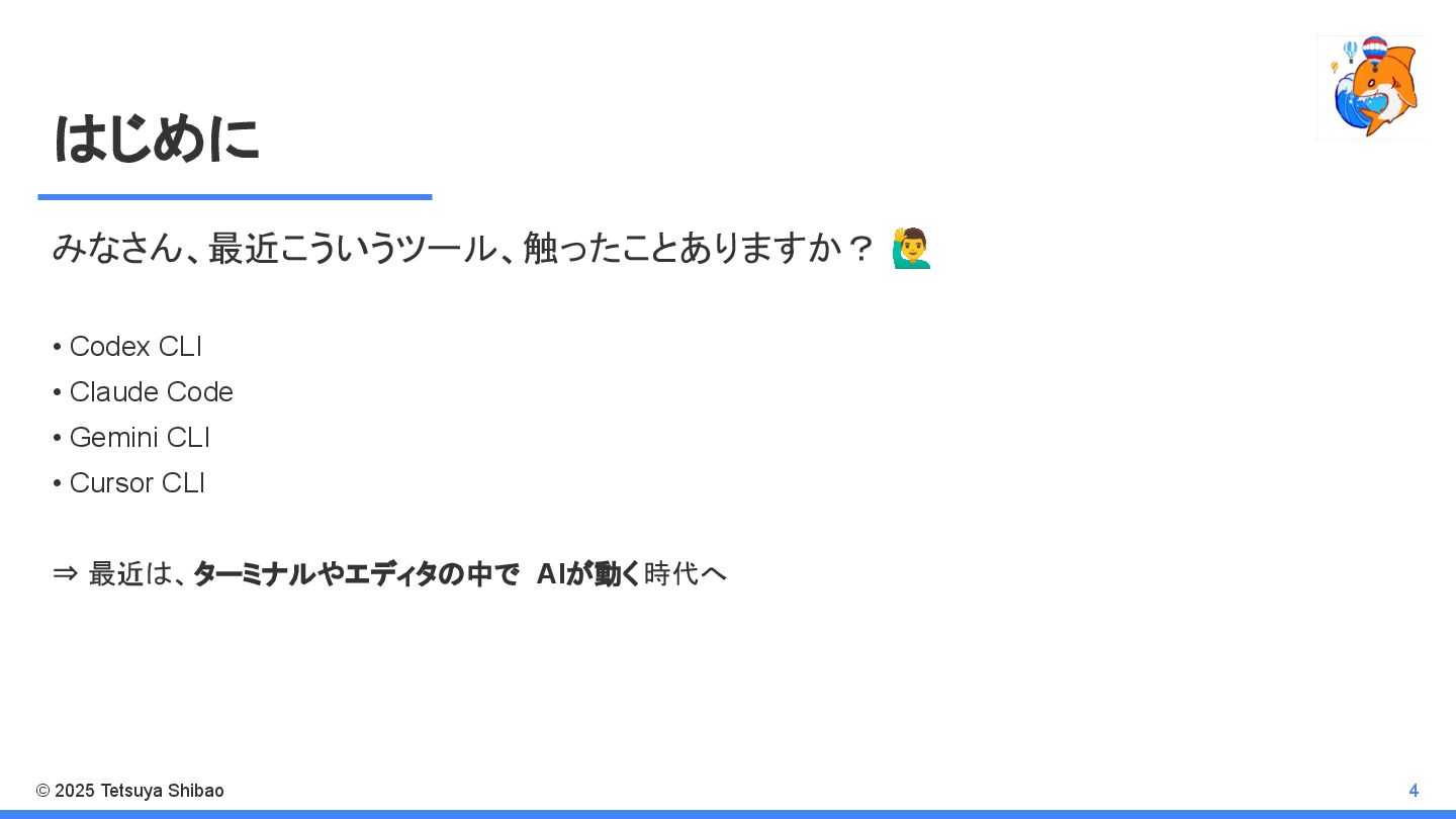 • Cursor CLI ⇒ 最近は、ターミナルやエディタの中で AIが動く時代へ みなさん、最近こういうツール、触ったことありますか? 4 © 2025 Tetsuya Shibao