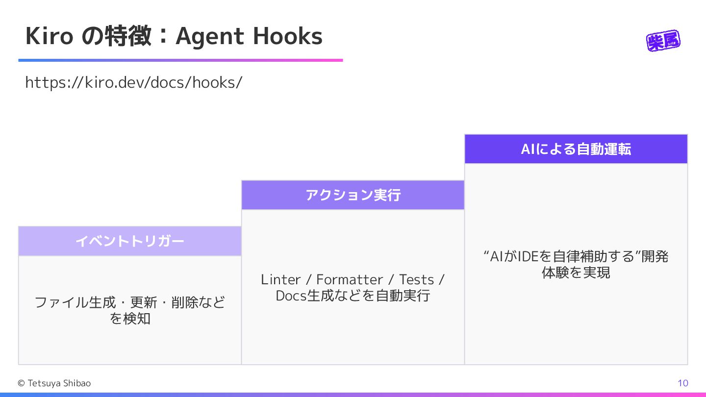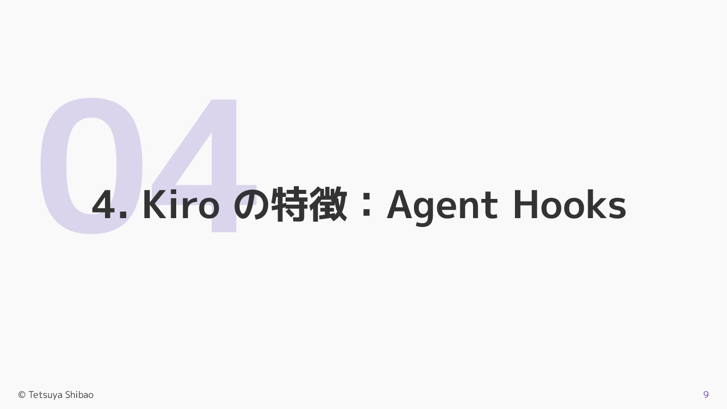 04 4. Kiro の特徴:Agent Hooks © Tetsuya Shibao 9