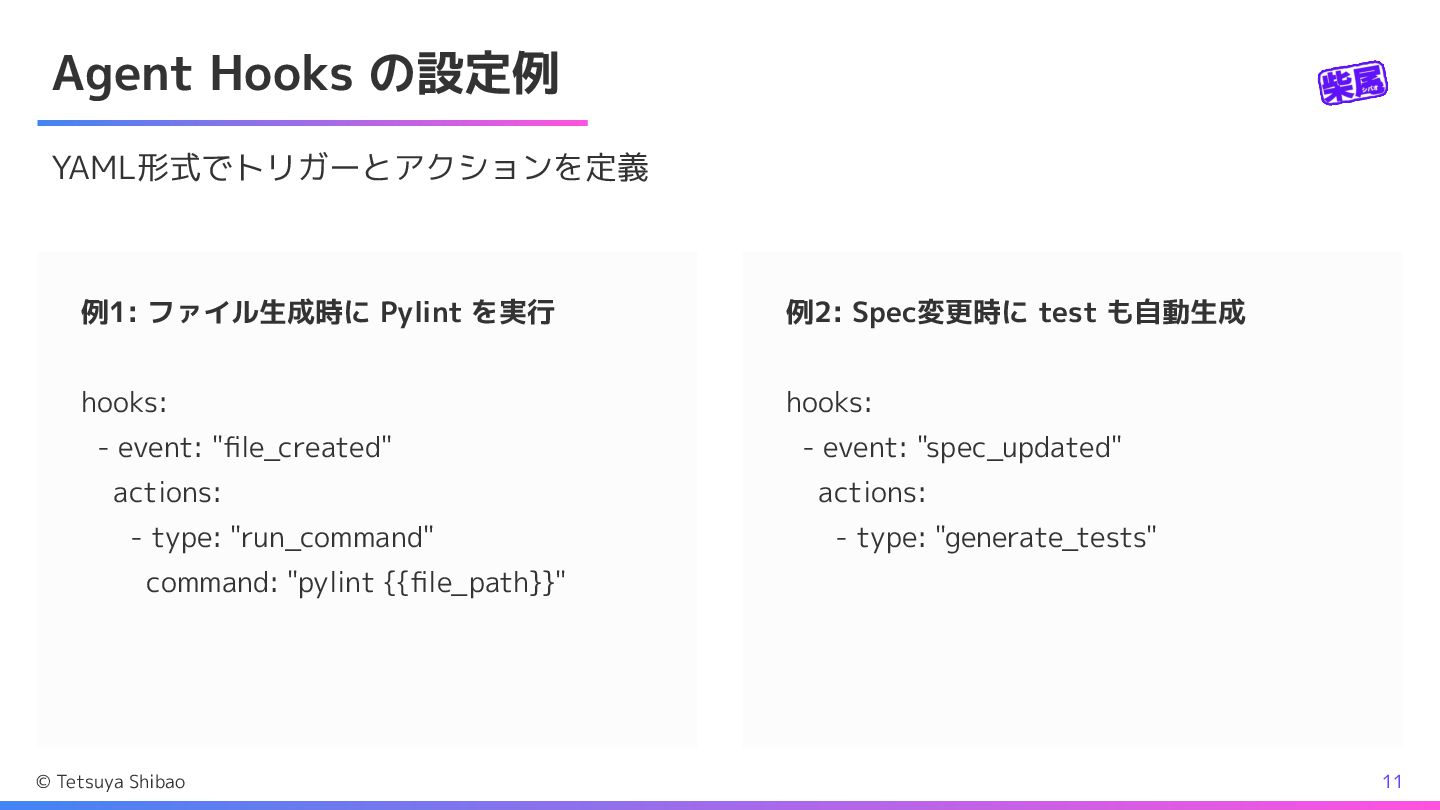 event: "file_created" actions: - type: "run_command" command: "pylint {{file_path}}" 例2: Spec変更時に test も自動生成 hooks: - event: "spec_updated" actions: - type: "generate_tests" © Tetsuya Shibao 11