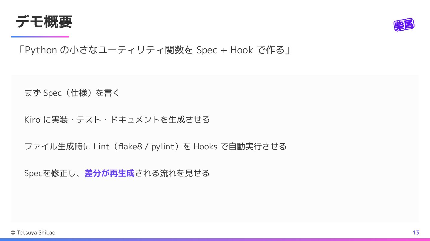 に実装・テスト・ドキュメントを生成させる ファイル生成時に Lint(flake8 / pylint)を Hooks で自動実行させる Specを修正し、差分が再生成される流れを見せる © Tetsuya Shibao 13