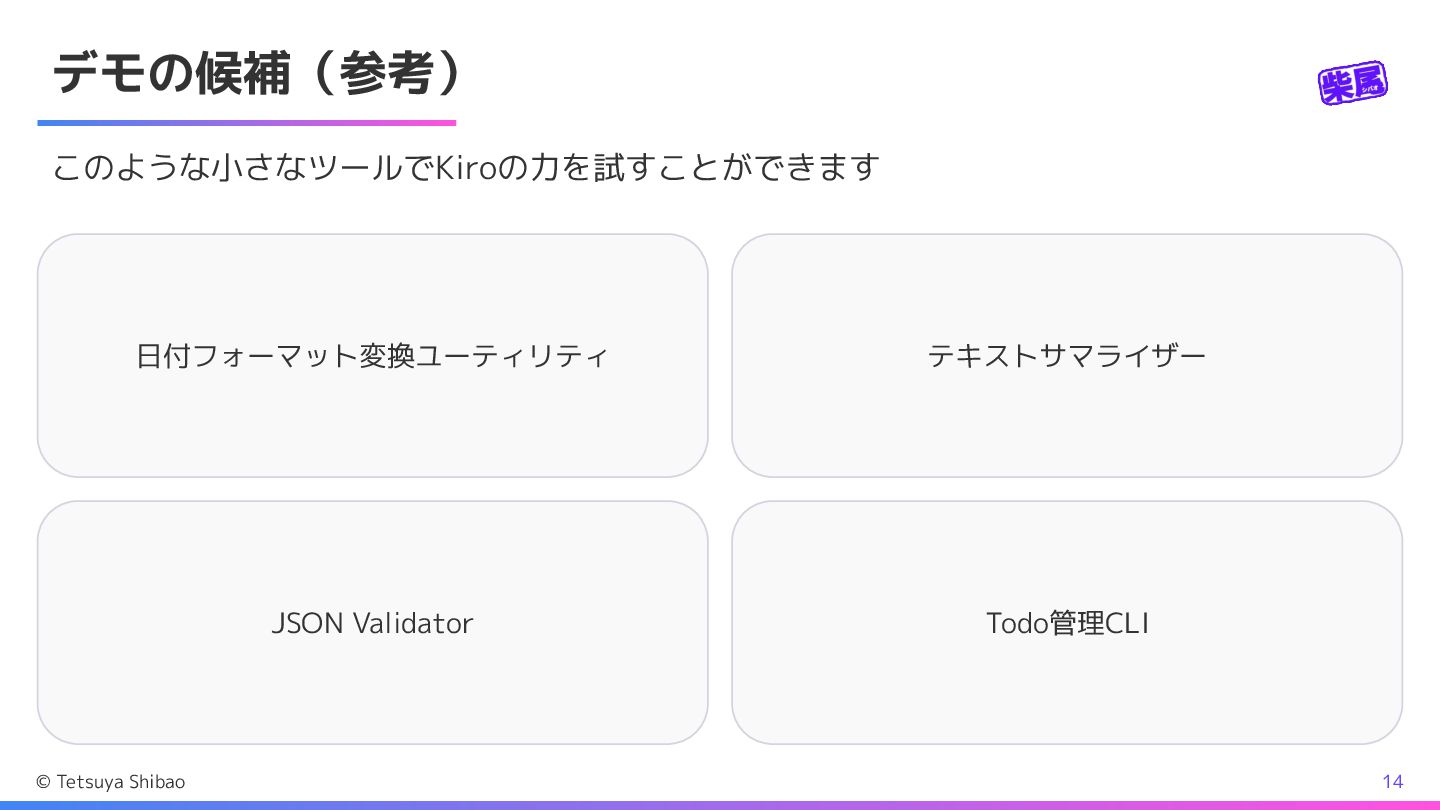 デモの候補(参考) このような小さなツールでKiroの力を試すことができます 日付フォーマット変換ユーティリティ テキストサマライザー JSON Validator Todo管理CLI © Tetsuya Shibao