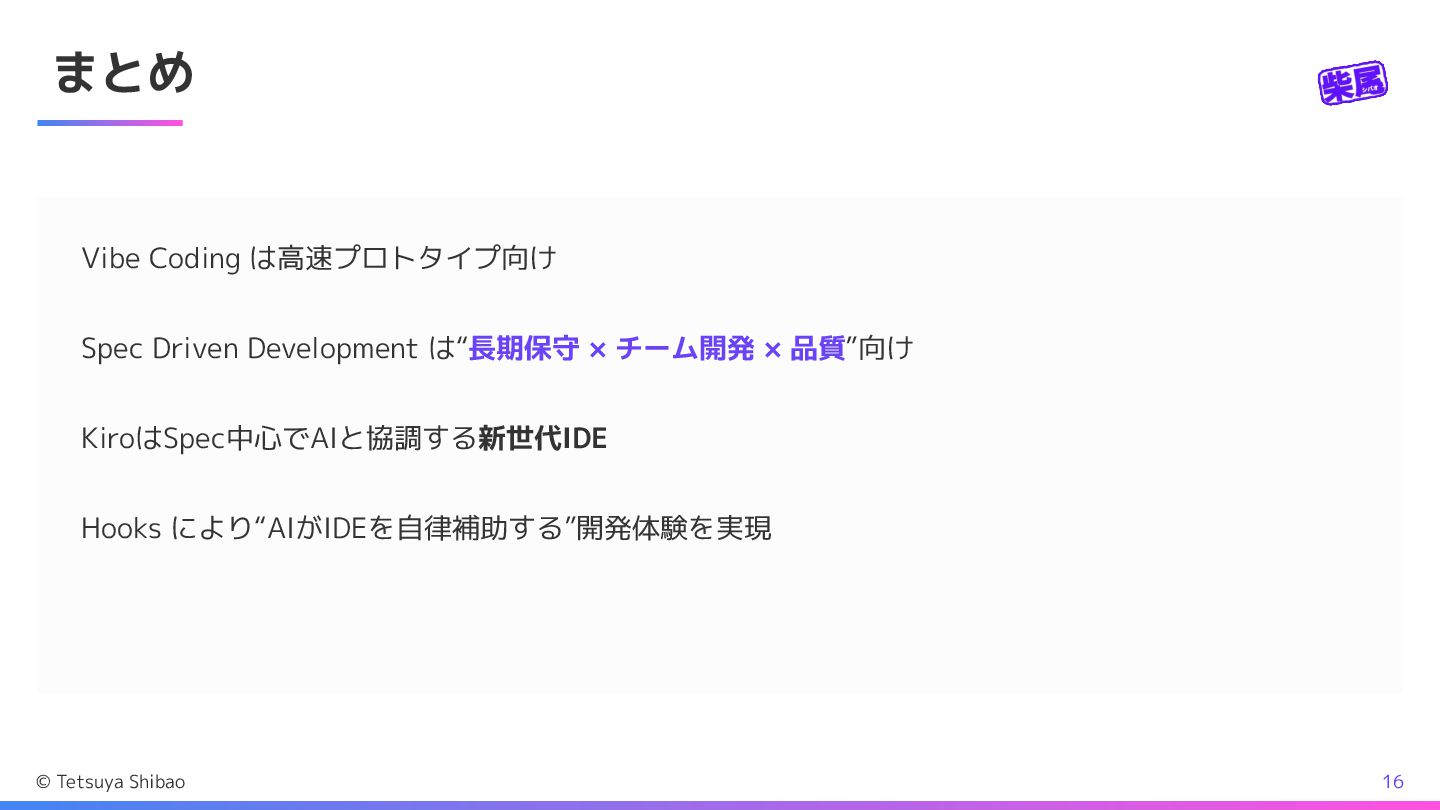 × 品質”向け KiroはSpec中心でAIと協調する新世代IDE Hooks により“AIがIDEを自律補助する”開発体験を実現 © Tetsuya Shibao 16