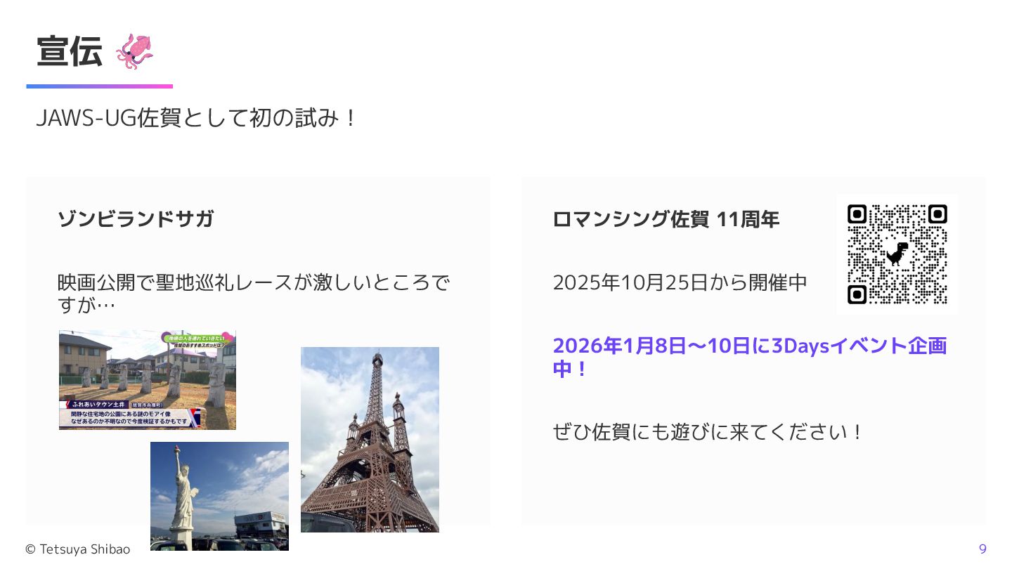 宣伝 🦑 JAWS-UG佐賀として初の試み! ゾンビランドサガ 映画公開で聖地巡礼レースが激しいところで すが… ロマンシング佐賀 11周年 2025年10月25日から開催中 2026年1月8日〜10日に3Daysイベント企画