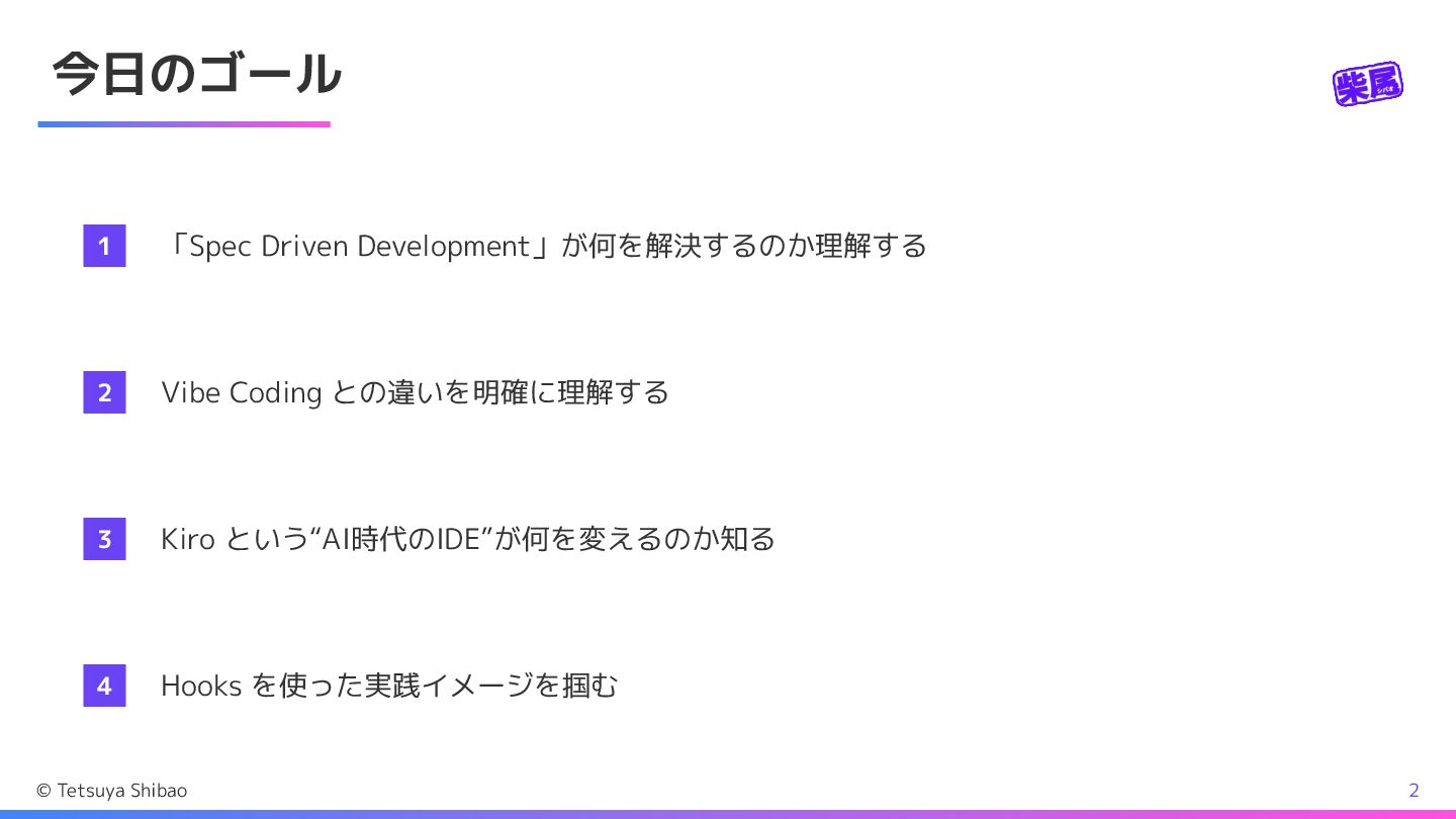今日のゴール 1 「Spec Driven Development」が何を解決するのか理解する 2 Vibe Coding との違いを明確に理解する 3