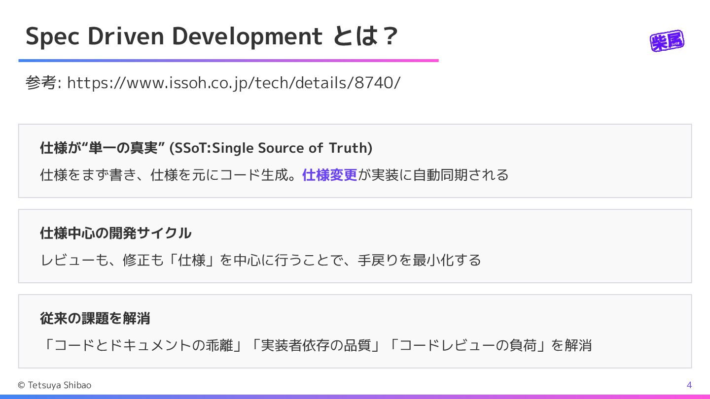 Truth) 仕様をまず書き、仕様を元にコード生成。仕様変更が実装に自動同期される 仕様中心の開発サイクル レビューも、修正も「仕様」を中心に行うことで、手戻りを最小化する 従来の課題を解消 「コードとドキュメントの乖離」「実装者依存の品質」「コードレビューの負荷」を解消 © Tetsuya Shibao 4