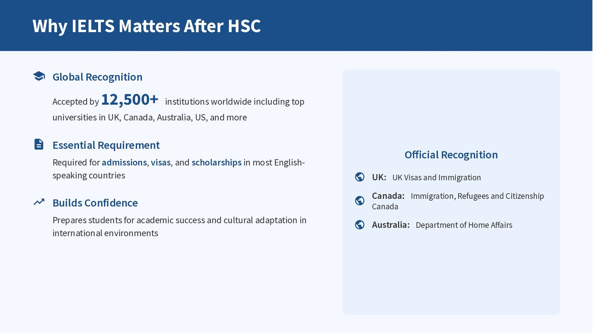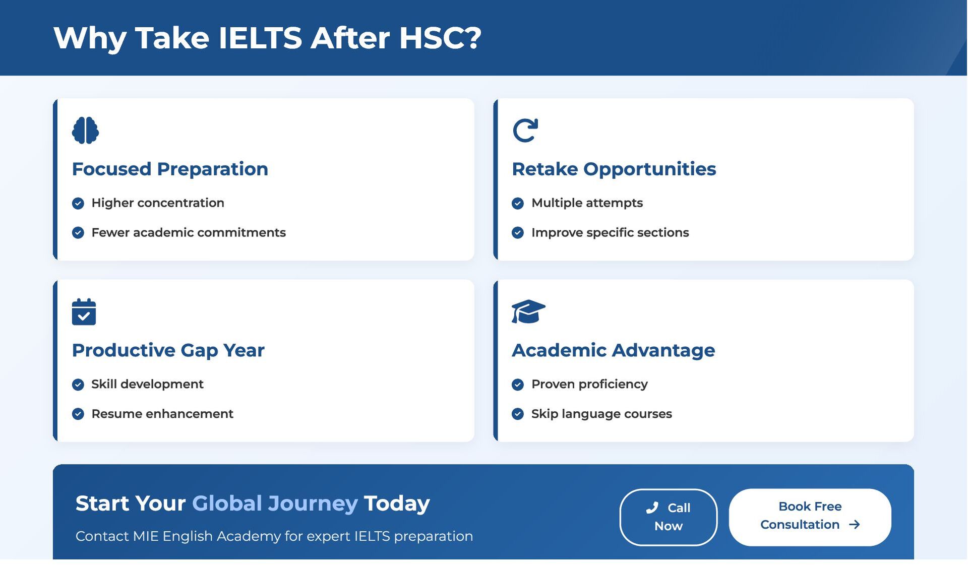 Securing admission to a top university abroad often requires a strong IELTS score. For students who have completed their Higher Secondary Certificate (HSC), preparing for this exam is an important step toward international education. MIE English Academy offers expert guidance and structured training to help students reach the scores demanded by leading universities worldwide. With the right preparation and consistent support, students can achieve their academic goals and begin their journey toward higher studies.