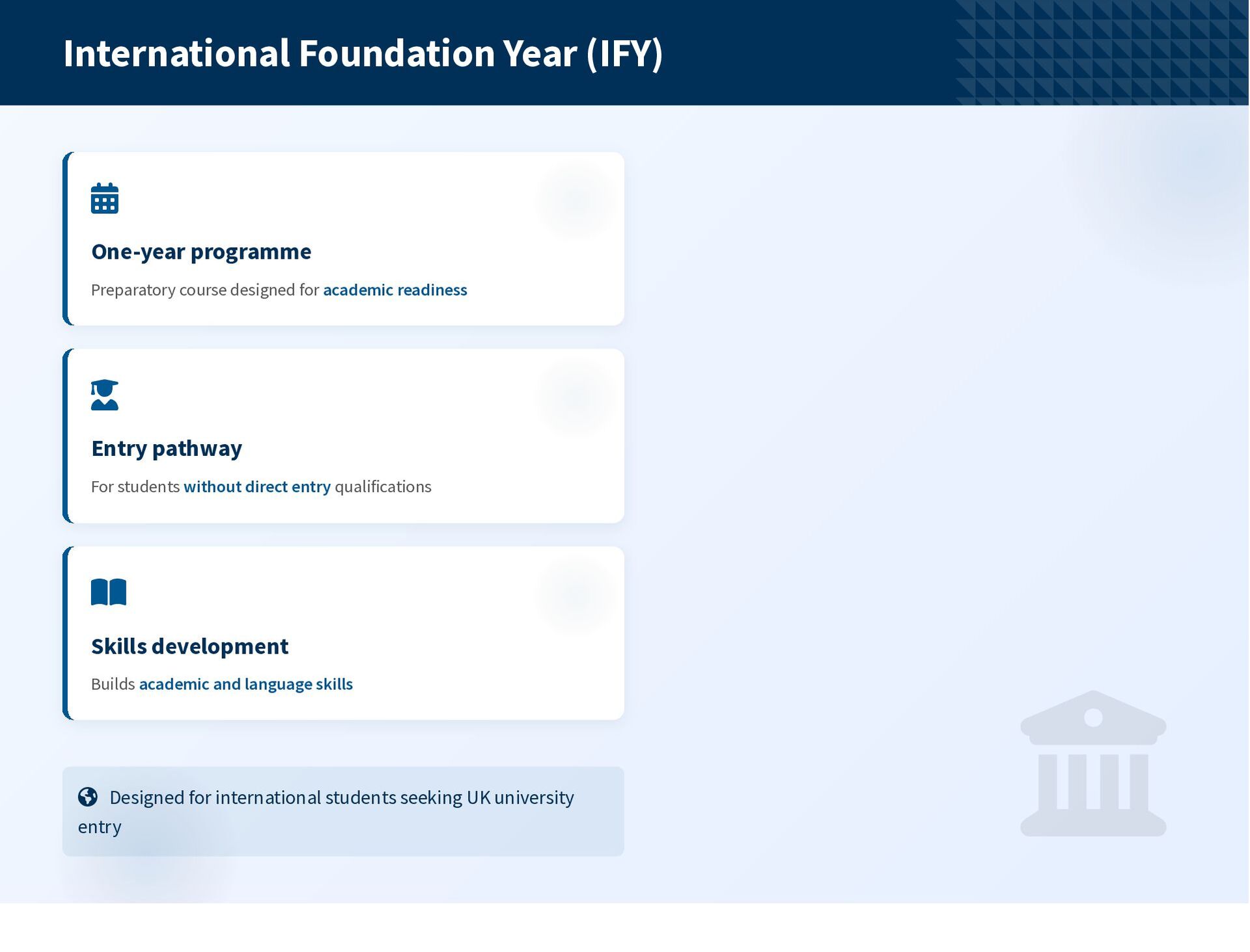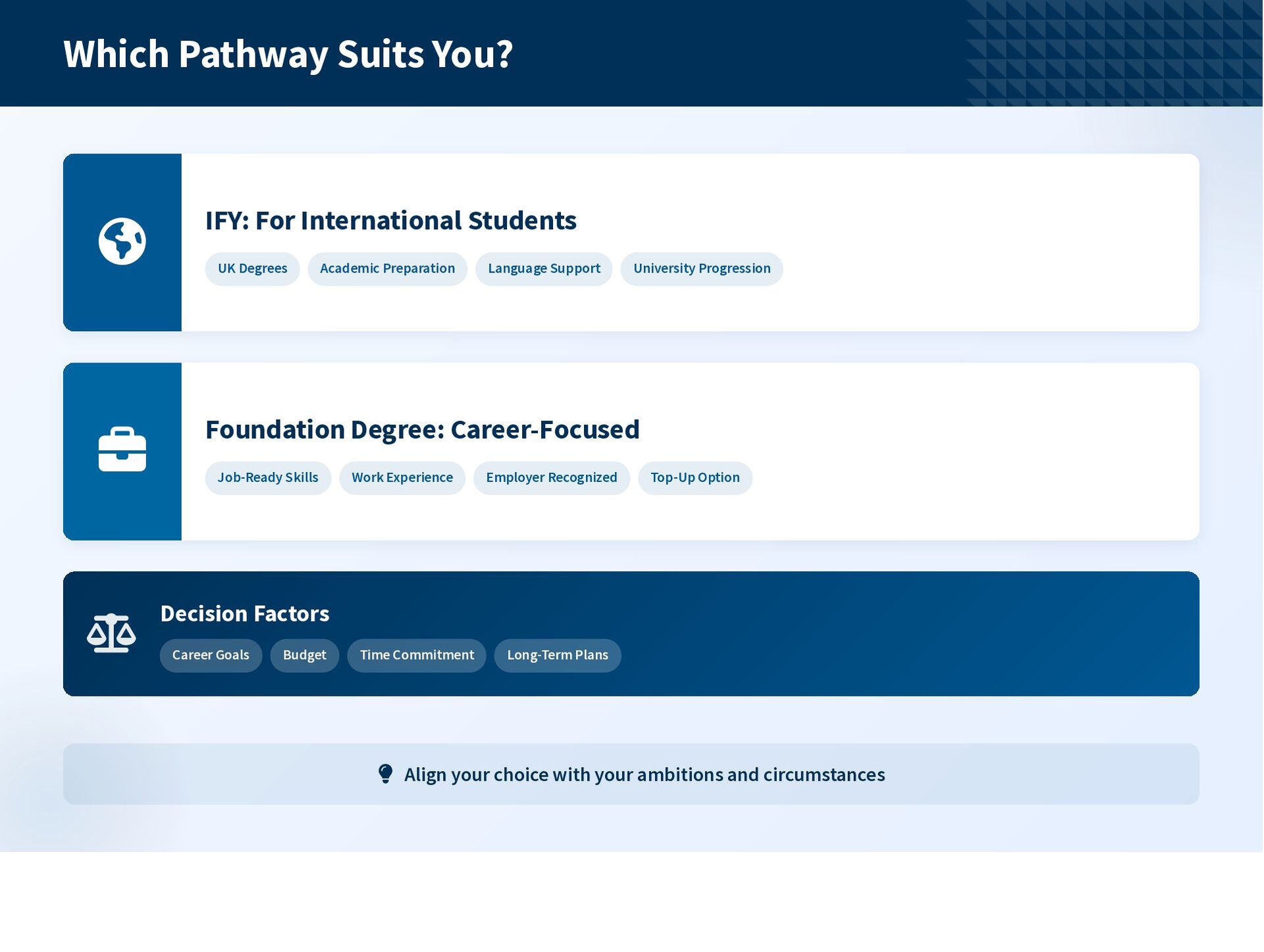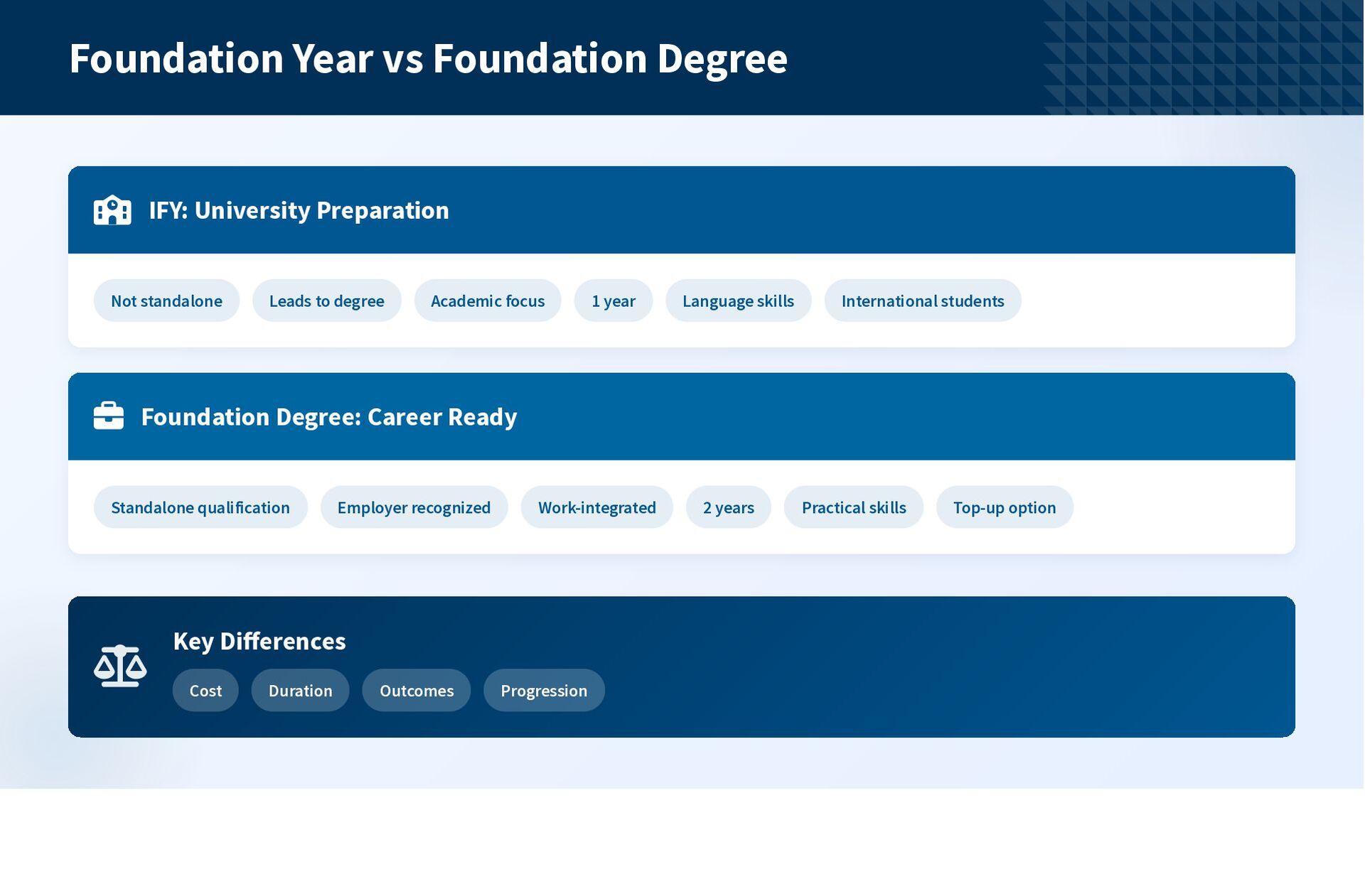 Students planning to study in the UK often come across two similar-sounding options: the International Foundation Year and the Foundation Degree. Both are important pathways, but their goals, structures, and outcomes are very different. One helps international students progress into university, while the other blends practical skills with academic study to prepare for employment. Knowing the difference helps students make informed decisions that match their ambitions. This guide explains each pathway in detail, compares their benefits, and highlights which choice may suit different types of learners.