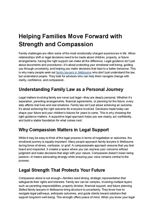 Family transitions can be challenging, but they also present the opportunity to begin again with clarity and confidence. With the help of understanding and skilled family lawyers in Melbourne, families can navigate change with dignity, achieve fair outcomes, and build stronger futures. Strength protects your rights. Compassion protects your peace of mind. Together, they create the foundation for a better tomorrow—where families are not defined by their challenges, but by how they rise above them.