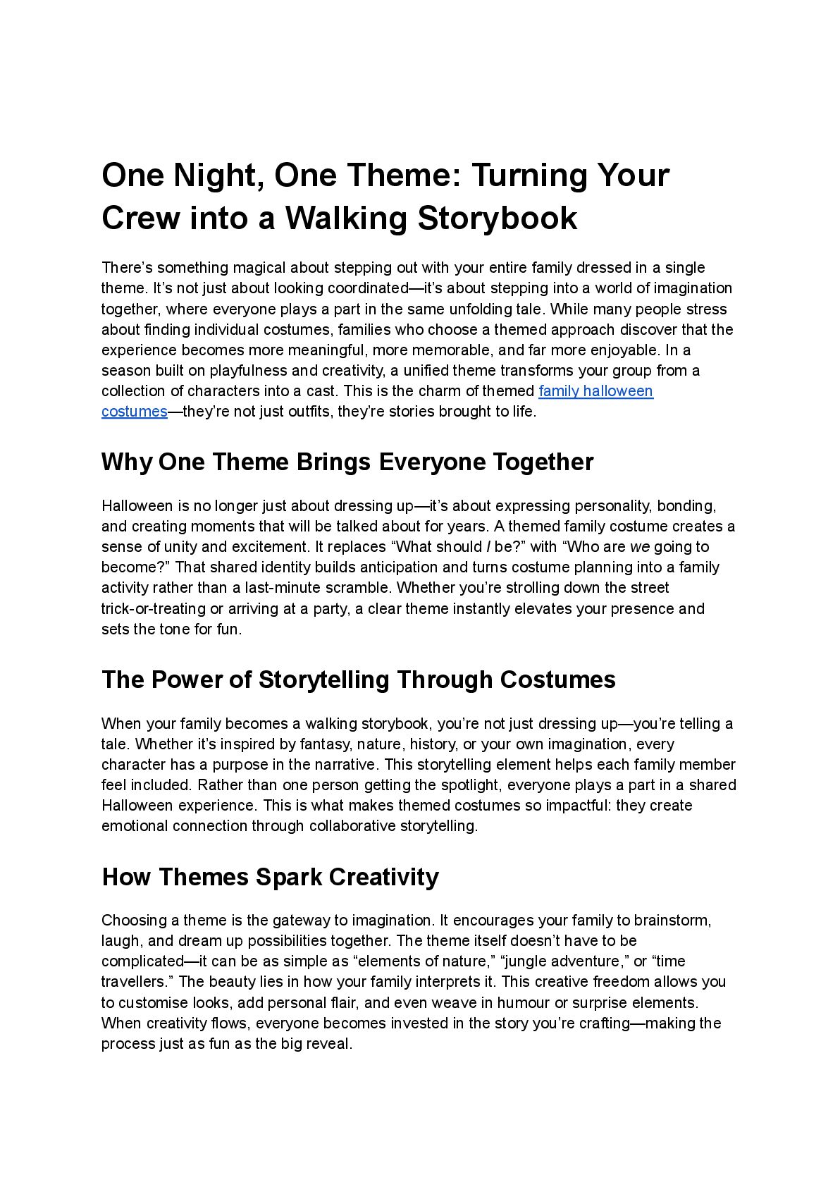 There’s something magical about stepping out with your entire family dressed in a single theme. It’s not just about looking coordinated—it’s about stepping into a world of imagination together, where everyone plays a part in the same unfolding tale. While many people stress about finding individual costumes, families who choose a themed approach discover that the experience becomes more meaningful, more memorable, and far more enjoyable. In a season built on playfulness and creativity, a unified theme transforms your group from a collection of characters into a cast. This is the charm of themed family halloween costumes—they’re not just outfits, they’re stories brought to life.