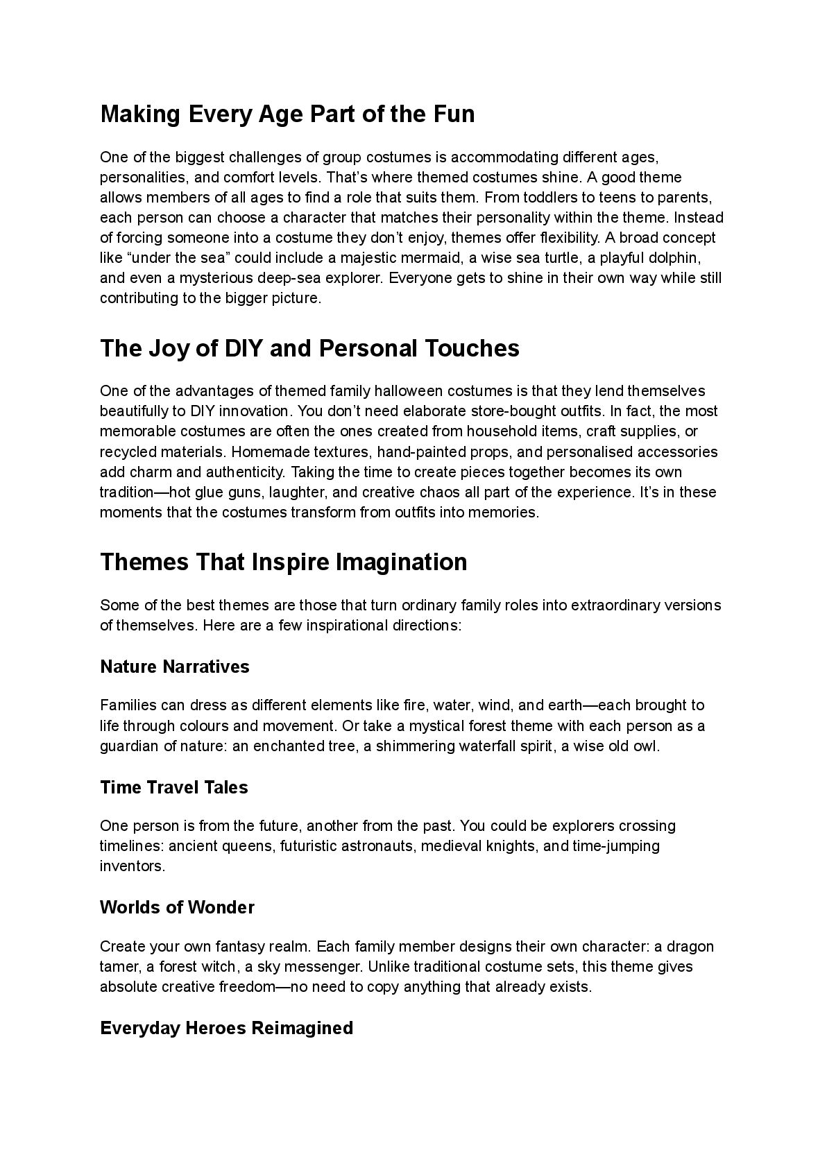 The beauty of family halloween costumes lies not just in how they look, but in what they represent. They turn Halloween into a shared celebration of imagination, bonding, and joy. Choosing one theme creates unity and heightens the fun, transforming your family from a group of individuals into a living, breathing story. On this one night, the world becomes your stage, and your family becomes the cast of a storybook no one will forget. Whether you choose enchantment, adventure, nature, or time travel, the theme you select can turn this Halloween into a chapter your family will treasure for years to come.