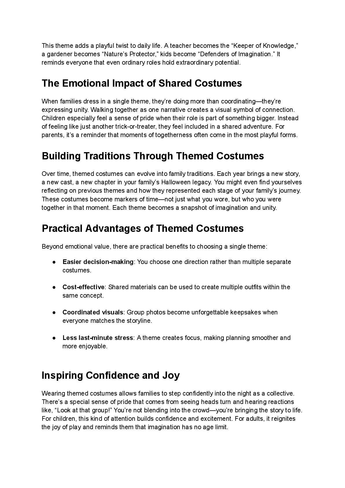 Over time, themed costumes can evolve into family traditions. Each year brings a new story, a new cast, a new chapter in your family’s Halloween legacy. You might even find yourselves reflecting on previous themes and how they represented each stage of your family’s journey. These costumes become markers of time—not just what you wore, but who you were together in that moment. Each theme becomes a snapshot of imagination and unity.