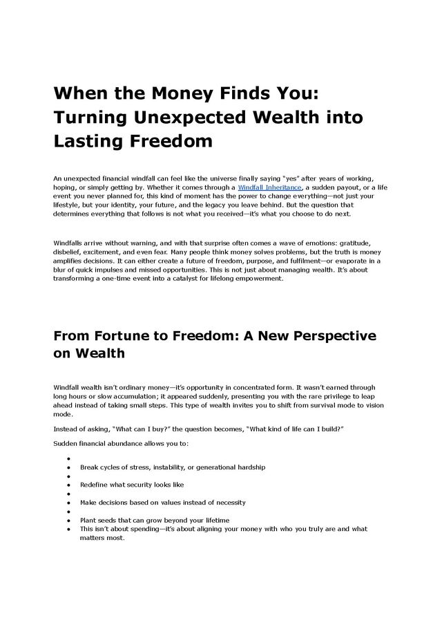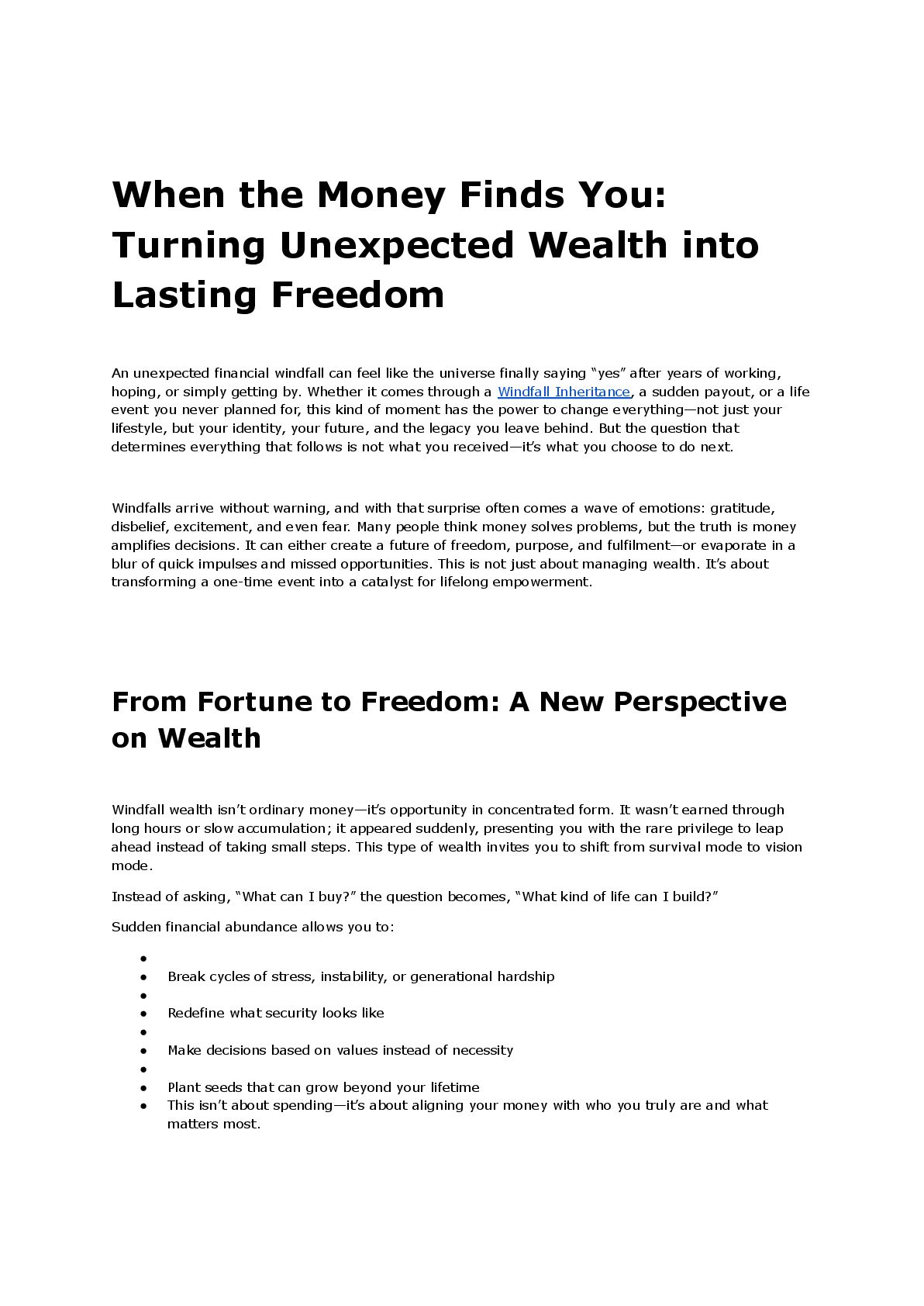 An unexpected financial windfall can feel like the universe finally saying “yes” after years of working, hoping, or simply getting by. Whether it comes through a Windfall Inheritance, a sudden payout, or a life event you never planned for, this kind of moment has the power to change everything—not just your lifestyle, but your identity, your future, and the legacy you leave behind. But the question that determines everything that follows is not what you received—it’s what you choose to do next.