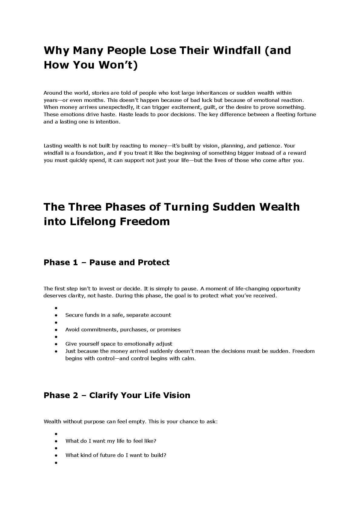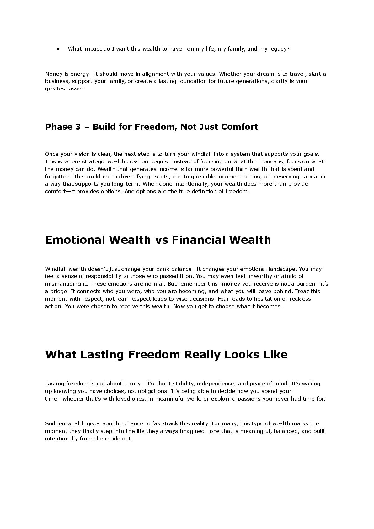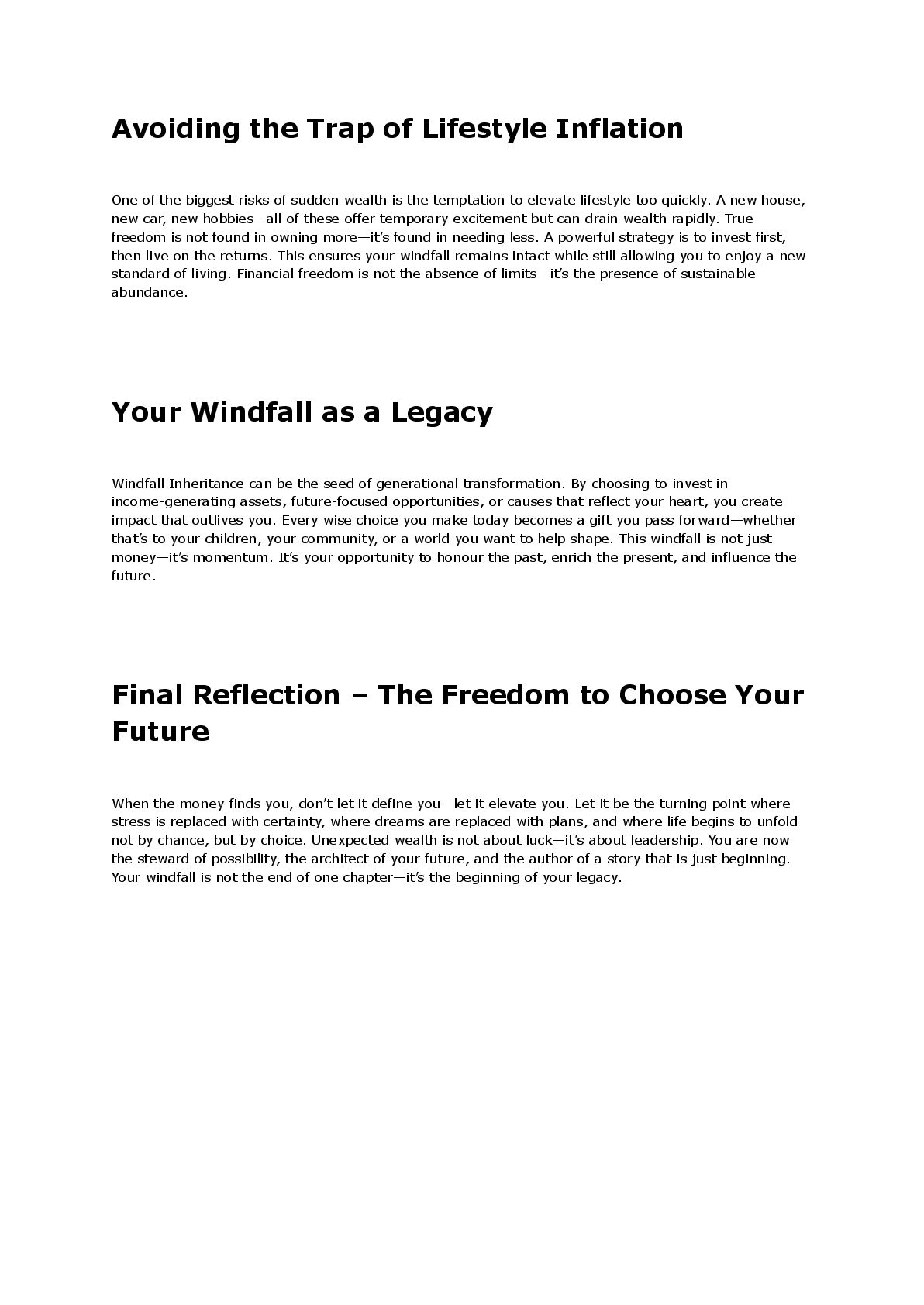 Windfall wealth doesn’t just change your bank balance—it changes your emotional landscape. You may feel a sense of responsibility to those who passed it on. You may even feel unworthy or afraid of mismanaging it. These emotions are normal. But remember this: money you receive is not a burden—it’s a bridge. It connects who you were, who you are becoming, and what you will leave behind. Treat this moment with respect, not fear. Respect leads to wise decisions. Fear leads to hesitation or reckless action. You were chosen to receive this wealth. Now you get to choose what it becomes.