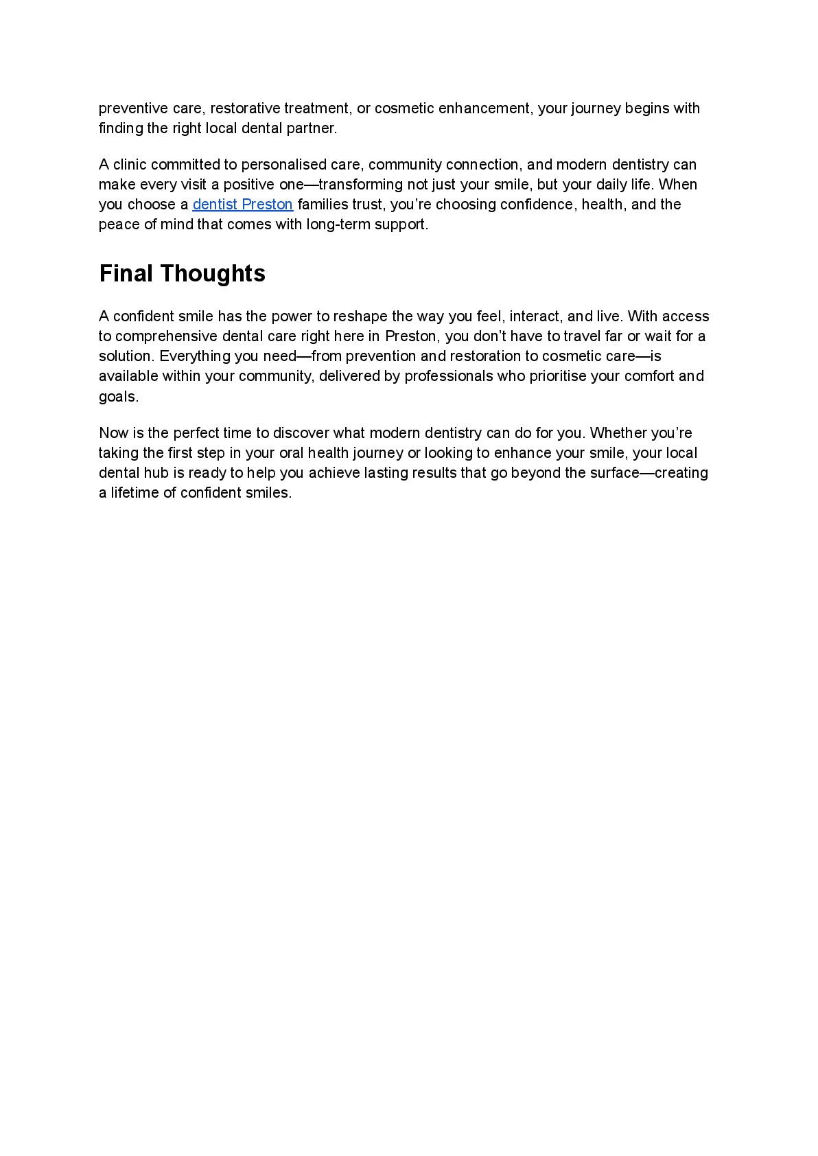 A confident smile has the power to reshape the way you feel, interact, and live. With access to comprehensive dental care right here in Preston, you don’t have to travel far or wait for a solution. Everything you need—from prevention and restoration to cosmetic care—is available within your community, delivered by professionals who prioritise your comfort and goals.