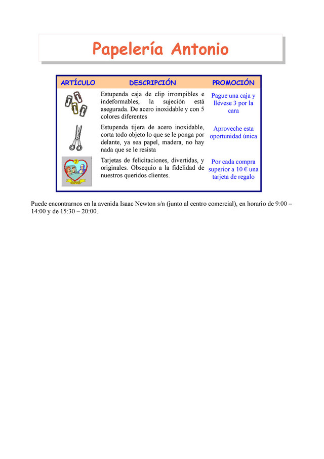la sujeción está asegurada. De acero inoxidable y con 5 colores diferentes Pague una caja y llévese 3 por la cara Estupenda tijera de acero inoxidable, corta todo objeto lo que se le ponga por delante, ya sea papel, madera, no hay nada que se le resista Aproveche esta oportunidad única Tarjetas de felicitaciones, divertidas, y originales. Obsequio a la fidelidad de nuestros queridos clientes. Por cada compra superior a 10 € una tarjeta de regalo Puede encontrarnos en la avenida Isaac Newton s/n (junto al centro comercial), en horario de 9:00 – 14:00 y de 15:30 – 20:00. Papelería Antonio