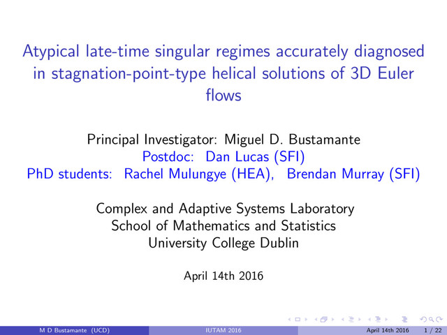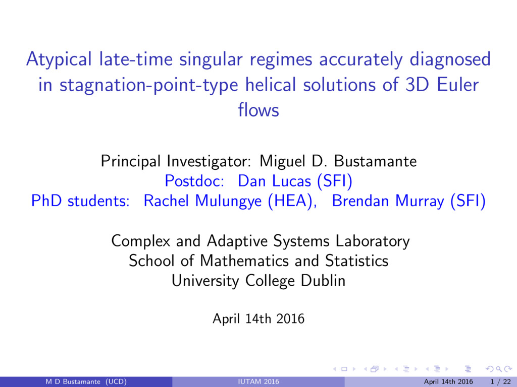 of 3D Euler flows Principal Investigator: Miguel D. Bustamante Postdoc: Dan Lucas (SFI) PhD students: Rachel Mulungye (HEA), Brendan Murray (SFI) Complex and Adaptive Systems Laboratory School of Mathematics and Statistics University College Dublin April 14th 2016 M D Bustamante (UCD) IUTAM 2016 April 14th 2016 1 / 22