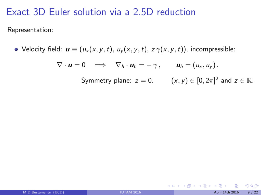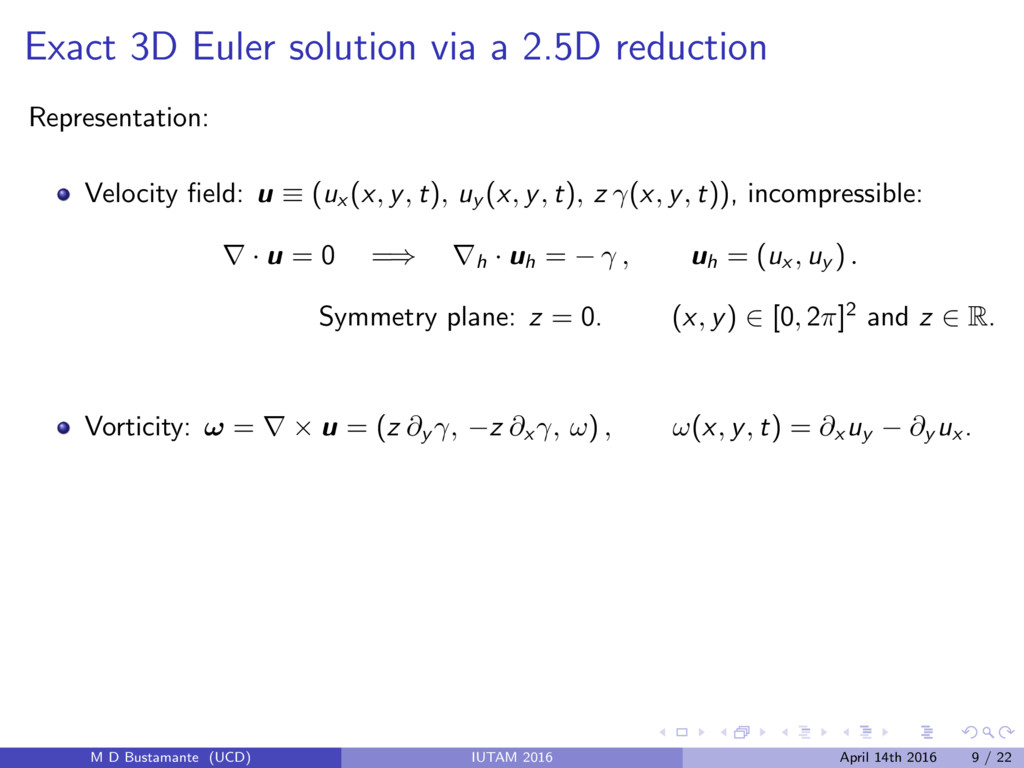 field: u ⌘ (u x (x, y, t), u y (x, y, t), z (x, y, t)), incompressible: r · u = 0 =) r h · uh = , uh = (u x , u y ) . Symmetry plane: z = 0. (x, y) 2 [0, 2⇡]2 and z 2 R. M D Bustamante (UCD) IUTAM 2016 April 14th 2016 9 / 22