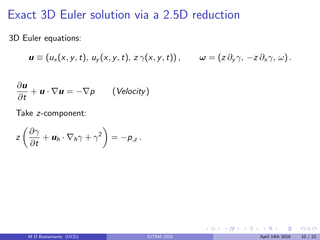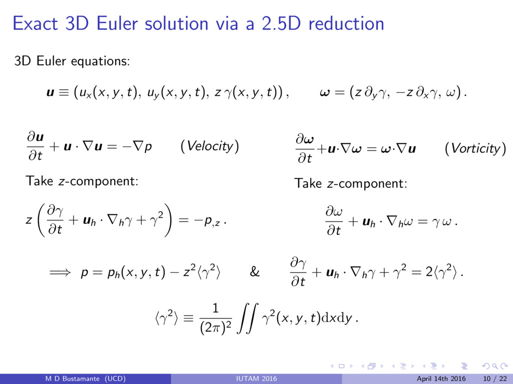 equations: u ⌘ (u x (x, y, t), u y (x, y, t), z (x, y, t)) , ! = (z @ y , z @ x , !) . @ u @t + u · r u = rp (Velocity) Take z-component: z ✓ @ @t + uh · r h + 2 ◆ = p, z . @! @t + u ·r! = !·r u (Vorticity) Take z-component: @! @t + uh · r h ! = ! . M D Bustamante (UCD) IUTAM 2016 April 14th 2016 10 / 22