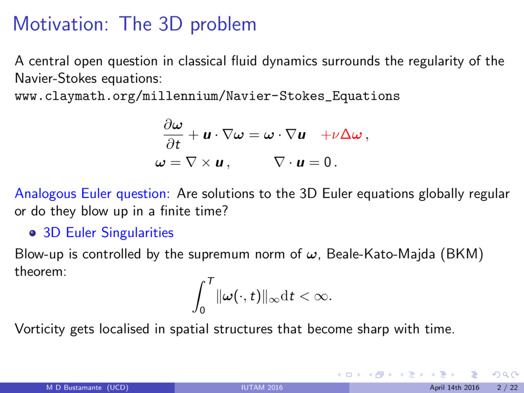 fluid dynamics surrounds the regularity of the Navier-Stokes equations: www.claymath.org/millennium/Navier-Stokes_Equations @! @t + u · r! = ! · r u +⌫ ! , ! = r ⇥ u , r · u = 0 . Analogous Euler question: Are solutions to the 3D Euler equations globally regular or do they blow up in a finite time? M D Bustamante (UCD) IUTAM 2016 April 14th 2016 2 / 22