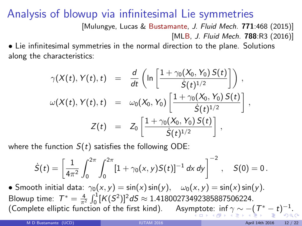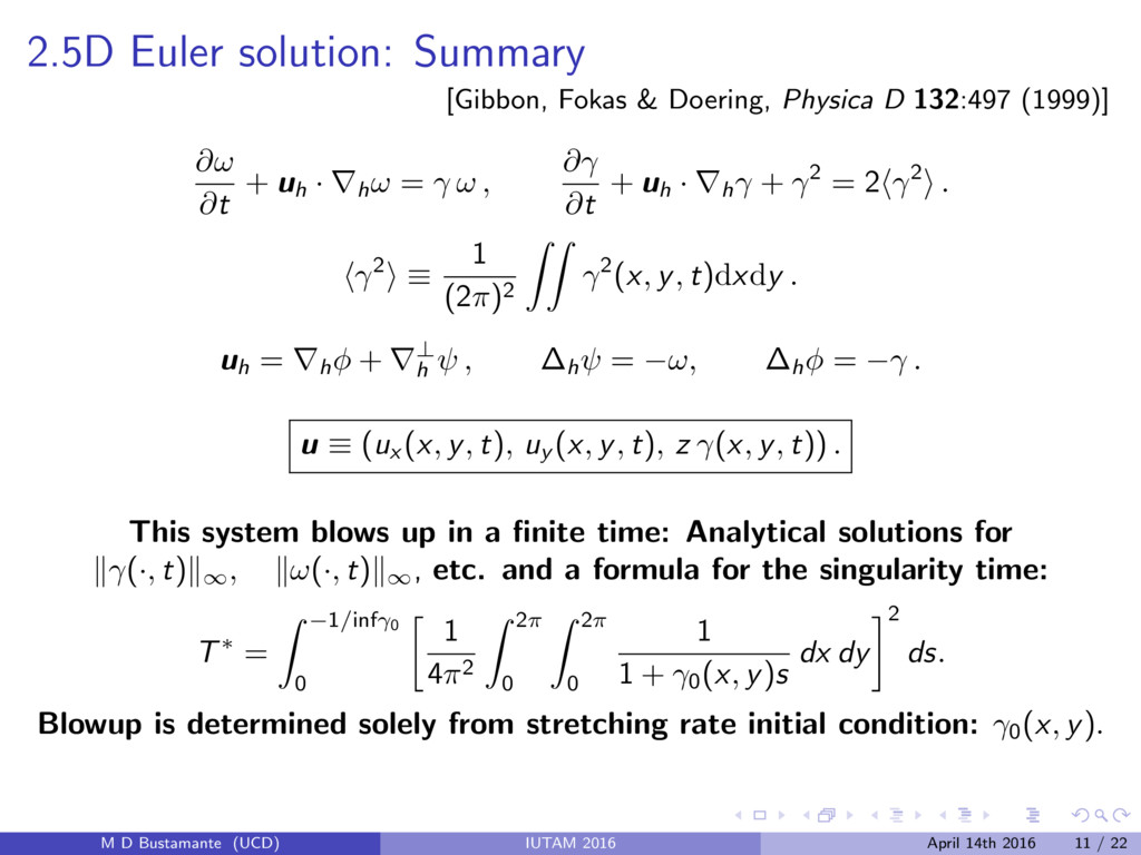 132:497 (1999)] @! @t + uh · r h ! = ! , @ @t + uh · r h + 2 = 2h 2i . h 2i ⌘ 1 (2⇡)2 ZZ 2(x, y, t)dxdy . uh = r h + r? h , h = !, h = . u ⌘ (u x (x, y, t), u y (x, y, t), z (x, y, t)) . This system blows up in a finite time: Analytical solutions for k (·, t)k1, k!(·, t)k1 , etc. and a formula for the singularity time: T⇤ = Z 1 / inf 0 0 1 4⇡2 Z 2 ⇡ 0 Z 2 ⇡ 0 1 1 + 0 (x, y)s dx dy 2 ds. Blowup is determined solely from stretching rate initial condition: 0 (x, y). M D Bustamante (UCD) IUTAM 2016 April 14th 2016 11 / 22
