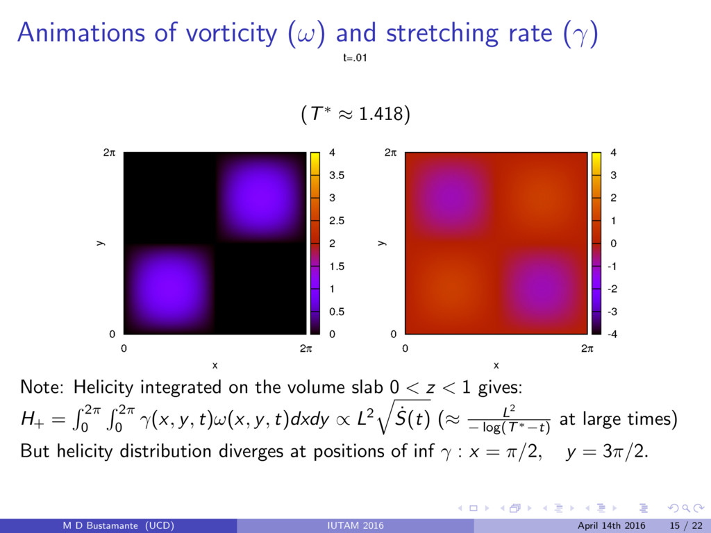 ⇡ 1.418) Note: Helicity integrated on the volume slab 0 < z < 1 gives: H + = R 2 ⇡ 0 R 2 ⇡ 0 (x, y, t)!(x, y, t)dxdy / L2 q ˙ S(t) (⇡ L2 log(T ⇤ t) at large times) But helicity distribution diverges at positions of inf : x = ⇡/2, y = 3⇡/2. M D Bustamante (UCD) IUTAM 2016 April 14th 2016 15 / 22