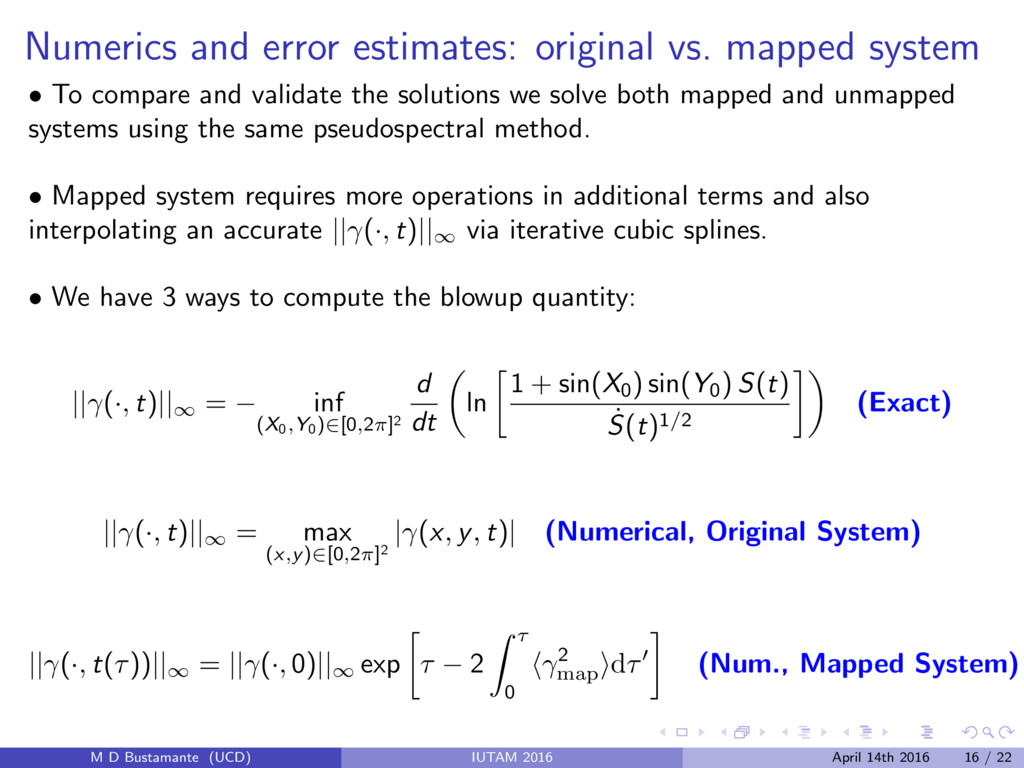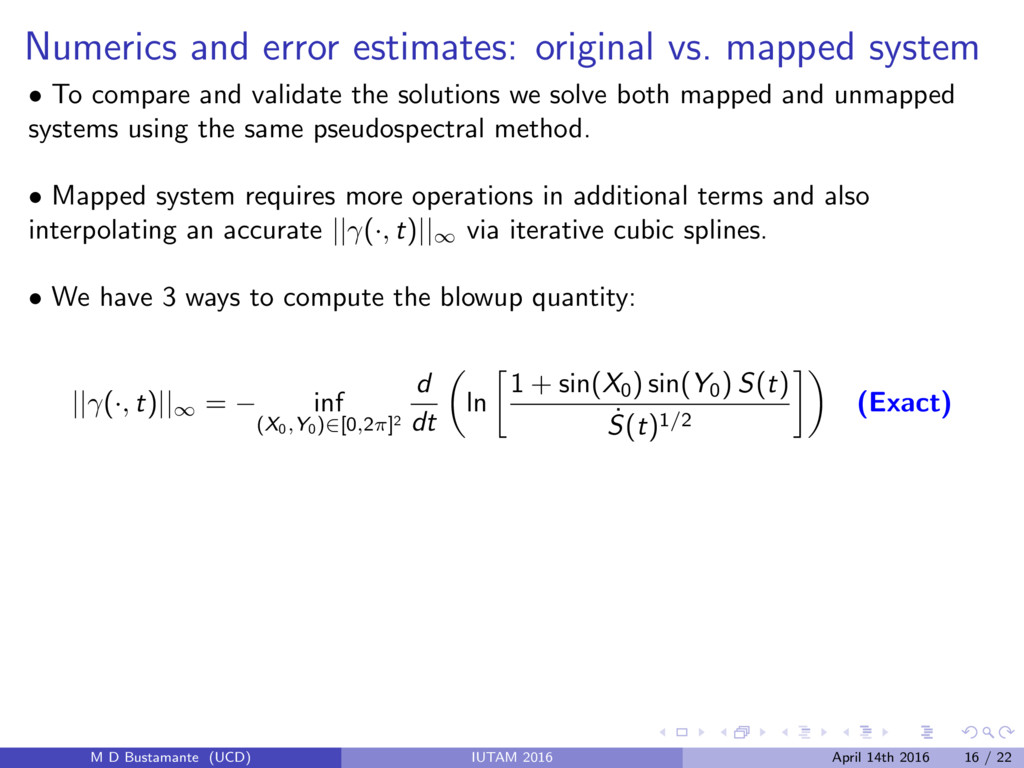 compare and validate the solutions we solve both mapped and unmapped systems using the same pseudospectral method. • Mapped system requires more operations in additional terms and also interpolating an accurate || (·, t)||1 via iterative cubic splines. • We have 3 ways to compute the blowup quantity: || (·, t)||1 = inf (X0 , Y0) 2 [0 , 2 ⇡ ]2 d dt ✓ ln 1 + sin(X 0 ) sin(Y 0 ) S(t) ˙ S(t)1 / 2 ◆ (Exact) M D Bustamante (UCD) IUTAM 2016 April 14th 2016 16 / 22