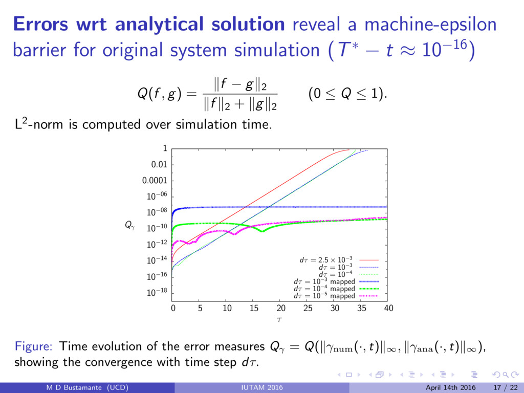 compare and validate the solutions we solve both mapped and unmapped systems using the same pseudospectral method. • Mapped system requires more operations in additional terms and also interpolating an accurate || (·, t)||1 via iterative cubic splines. M D Bustamante (UCD) IUTAM 2016 April 14th 2016 16 / 22