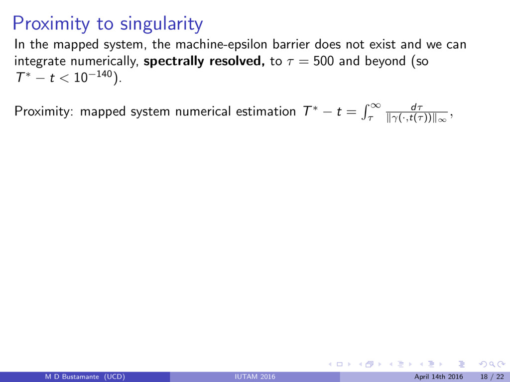 Nonlinearity 14:1239 (2001)] R t 0 k (·, t0)k1dt0 < 1 criterion for regularity. Define bijective time mapping: ⌧(t) ⌘ R t 0 k (·, t0)k1dt0 and normalise fields by map (x, y, ⌧) = (x, y, t) || (·, t)||1 , !map (x, y, ⌧) = !(x, y, t) || (·, t)||1 , M D Bustamante (UCD) IUTAM 2016 April 14th 2016 13 / 22
