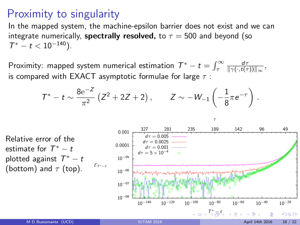 does not exist and we can integrate numerically, spectrally resolved, to ⌧ = 500 and beyond (so T⇤ t < 10 140 ). Proximity: mapped system numerical estimation T⇤ t = R 1 ⌧ d ⌧ k ( ·, t( ⌧ )) k1 , is compared with EXACT asymptotic formulae for large ⌧ : T⇤ t ⇠ 8e Z ⇡2 Z2 + 2Z + 2 , Z ⇠ W 1 ✓ 1 8 ⇡e ⌧ ◆ . Relative error of the estimate for T⇤ t plotted against T⇤ t (bottom) and ⌧ (top). 10 08 10 07 10 06 10 05 0.0001 0.001 10 140 327 10 120 281 10 100 235 10 80 189 10 60 142 10 40 96 10 20 49 E T ⇤ t T⇤ t ⌧ d⌧ = 0.005 d⌧ = 0.0025 d⌧ = 0.001 d⌧ = 5 ⇥ 10 4 M D Bustamante (UCD) IUTAM 2016 April 14th 2016 18 / 22